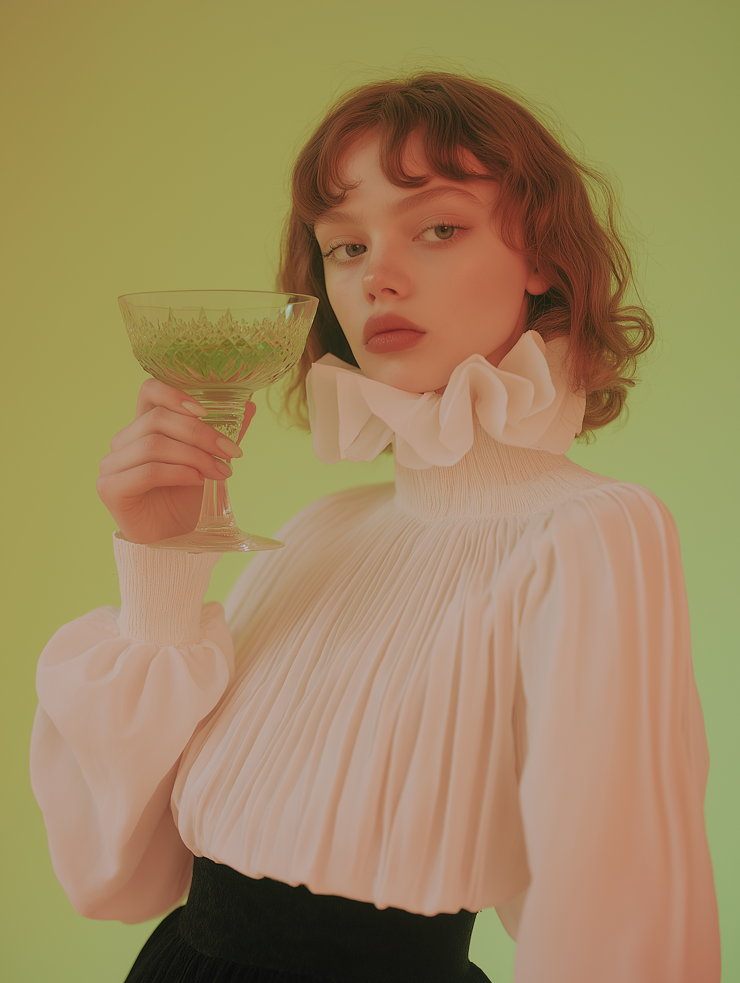 Elegant woman in a white blouse holding a green glass chalice against a soft green background.