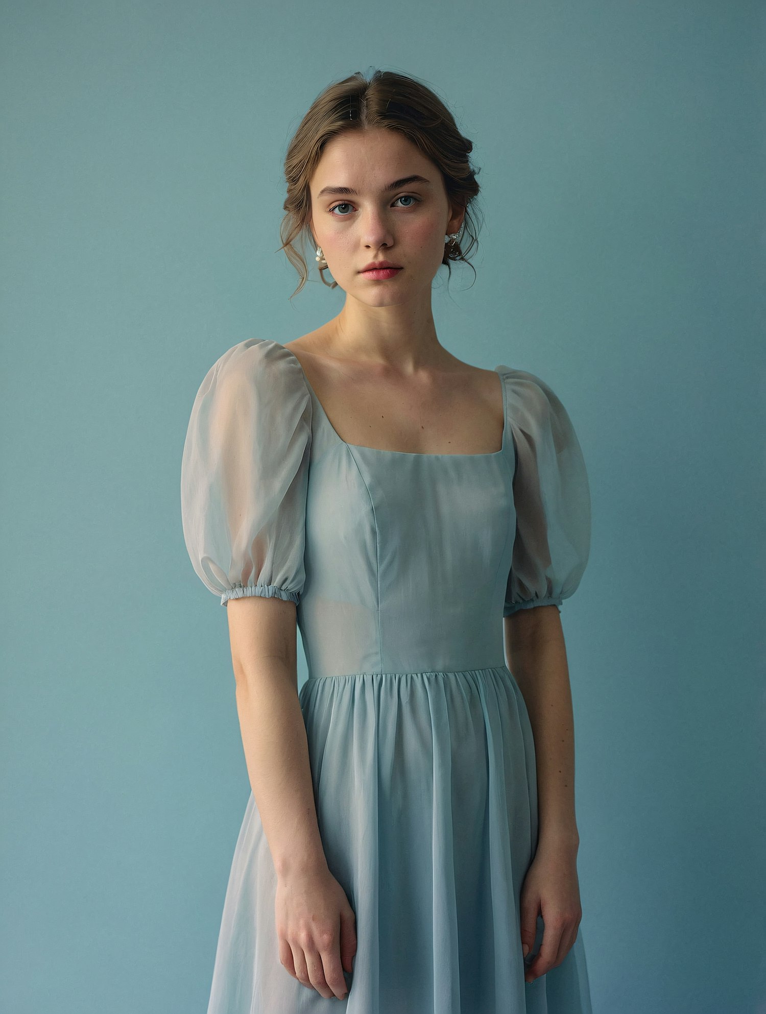 Young woman in a light blue vintage-style dress with puffed sleeves, standing against a blue background, wearing pearl drop earrings.