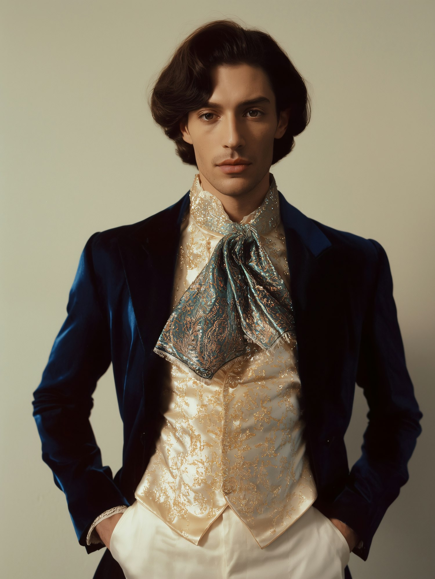 A person in a vintage-inspired outfit with a blue velvet jacket, embroidered vest, and silk cravat, standing against a neutral background.