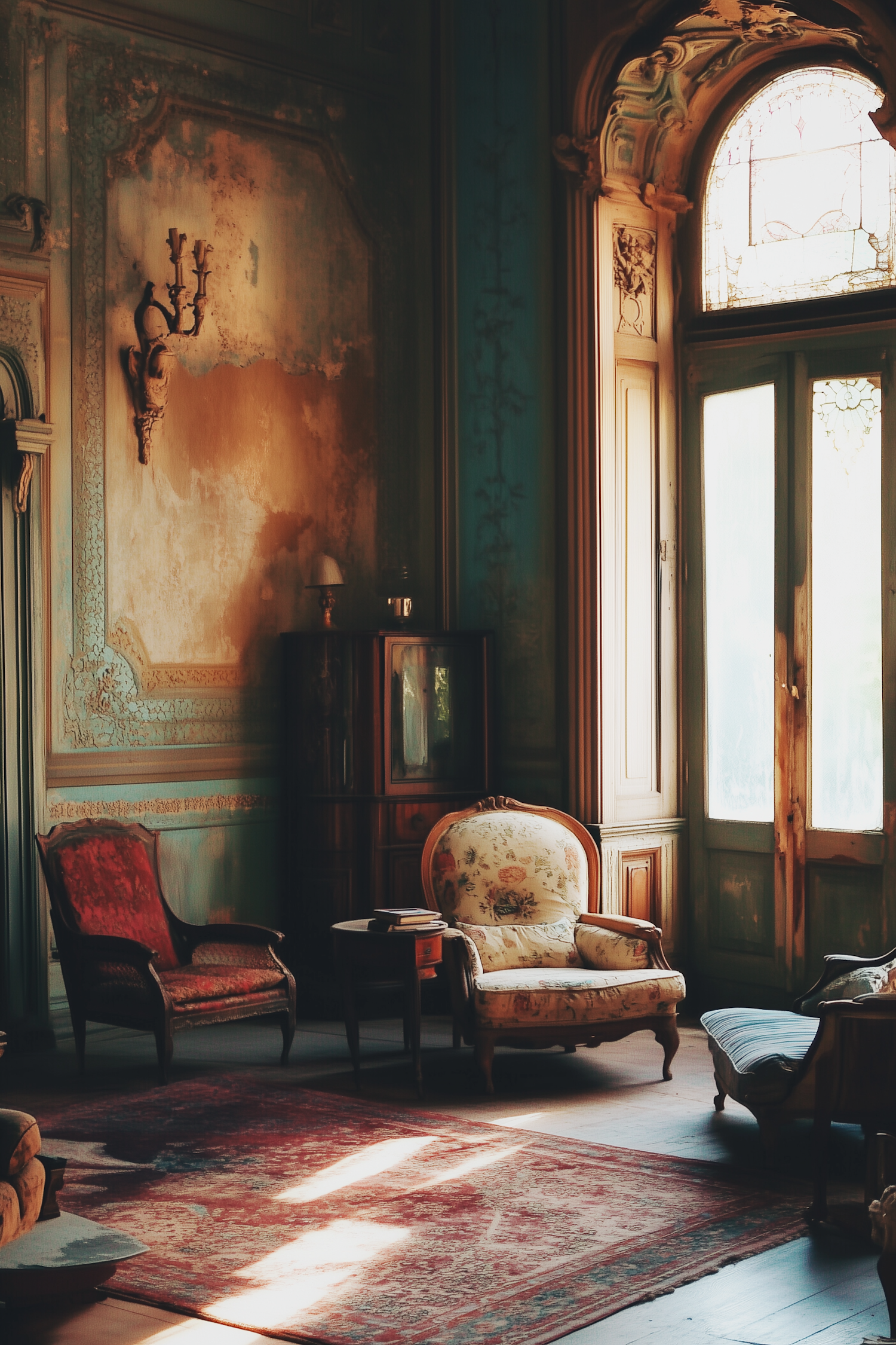 Elegant vintage room with ornate moldings, floral armchair, red velvet chair, and warm light through arched windows.