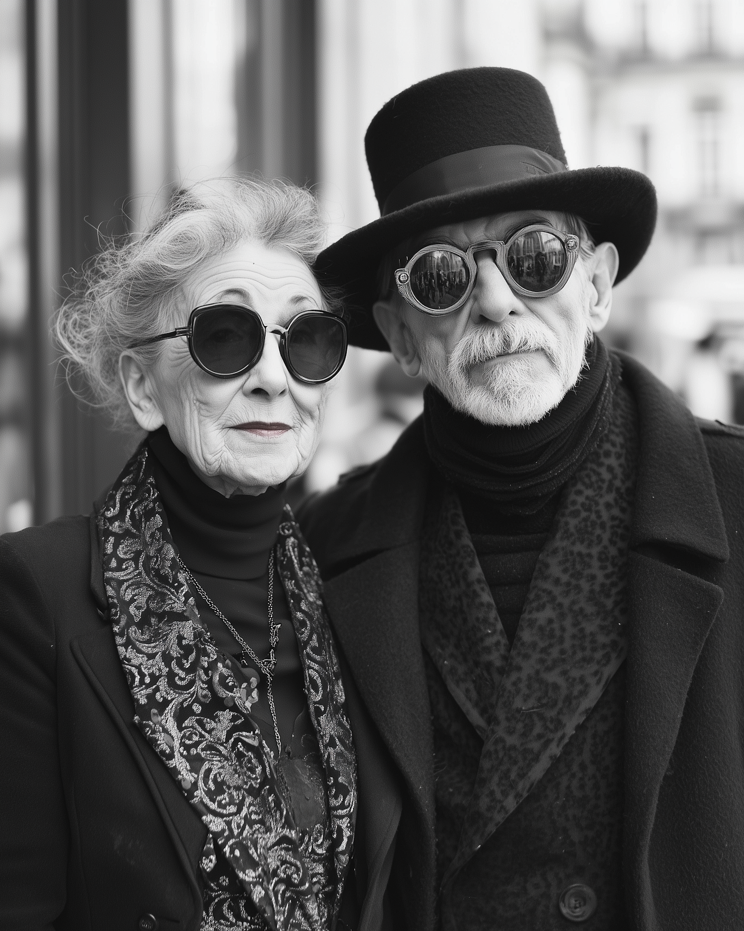 Stylish elderly couple in black and white, wearing unique sunglasses and elegant attire, exuding confidence and individuality.