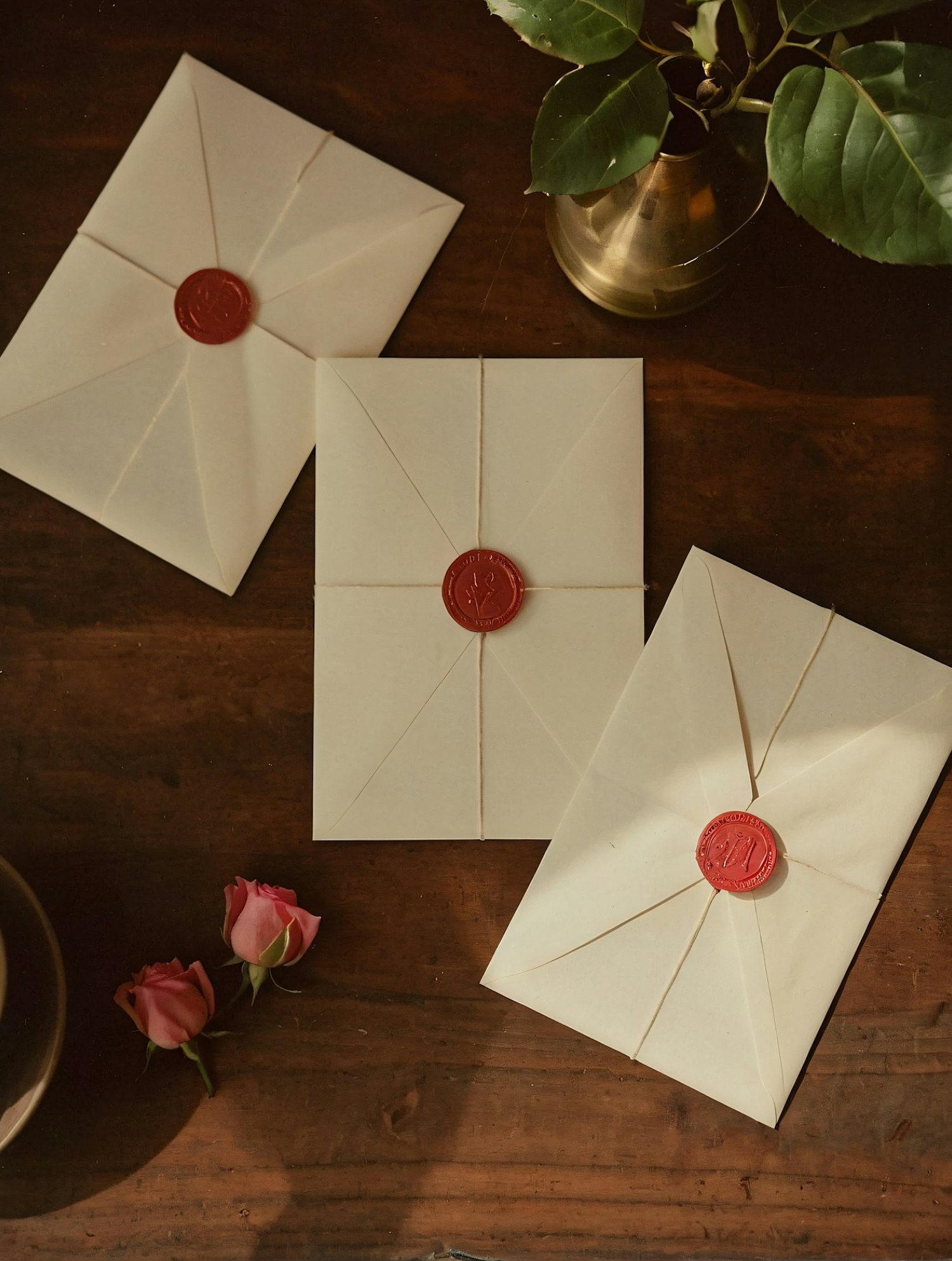 Three vintage envelopes with red wax seals on a wooden table, accompanied by pink rosebuds and a brass vase with green leaves.