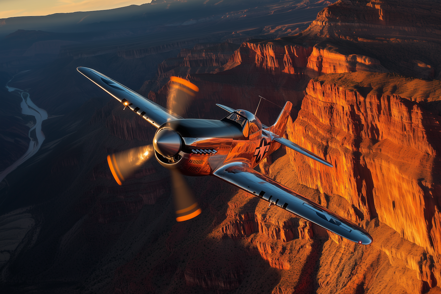 A gleaming vintage fighter plane flies over a sunlit canyon, its metallic body reflecting golden hues and a winding river below.