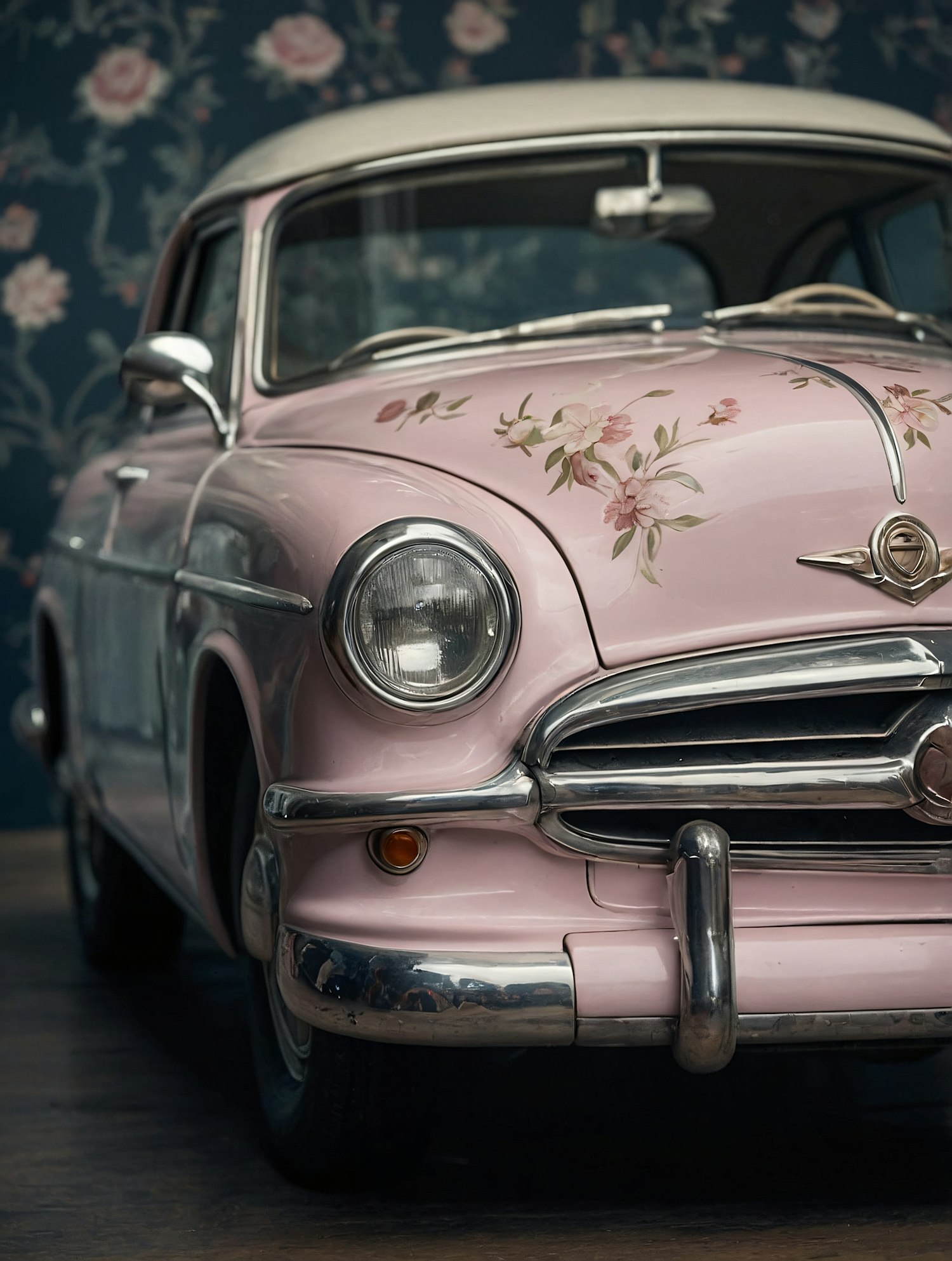 Vintage pink car with floral patterns, chrome details, and a cream roof against a floral wallpaper backdrop.