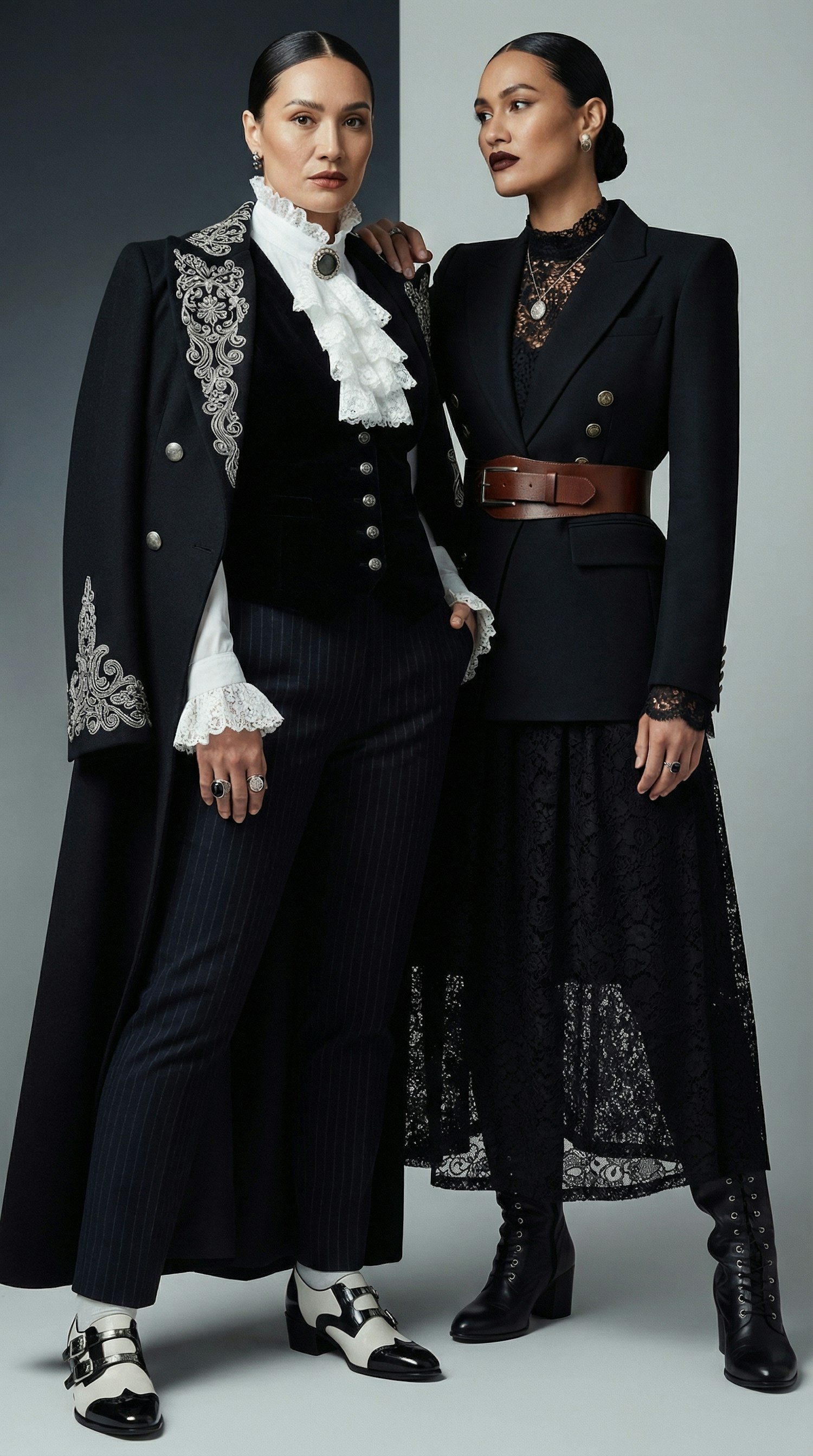 Two individuals in vintage-inspired formal attire, featuring intricate embroidery, lace, and bold accessories, exuding elegance and sophistication.