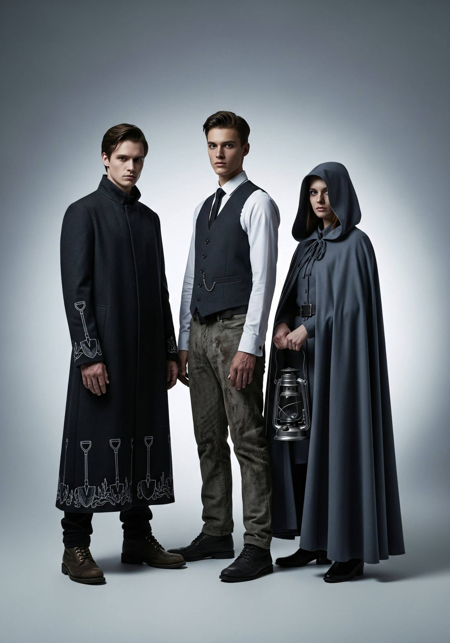 Three individuals in vintage-inspired attire, including a long coat, vest, and hooded cape, stand in a studio setting with a lantern.