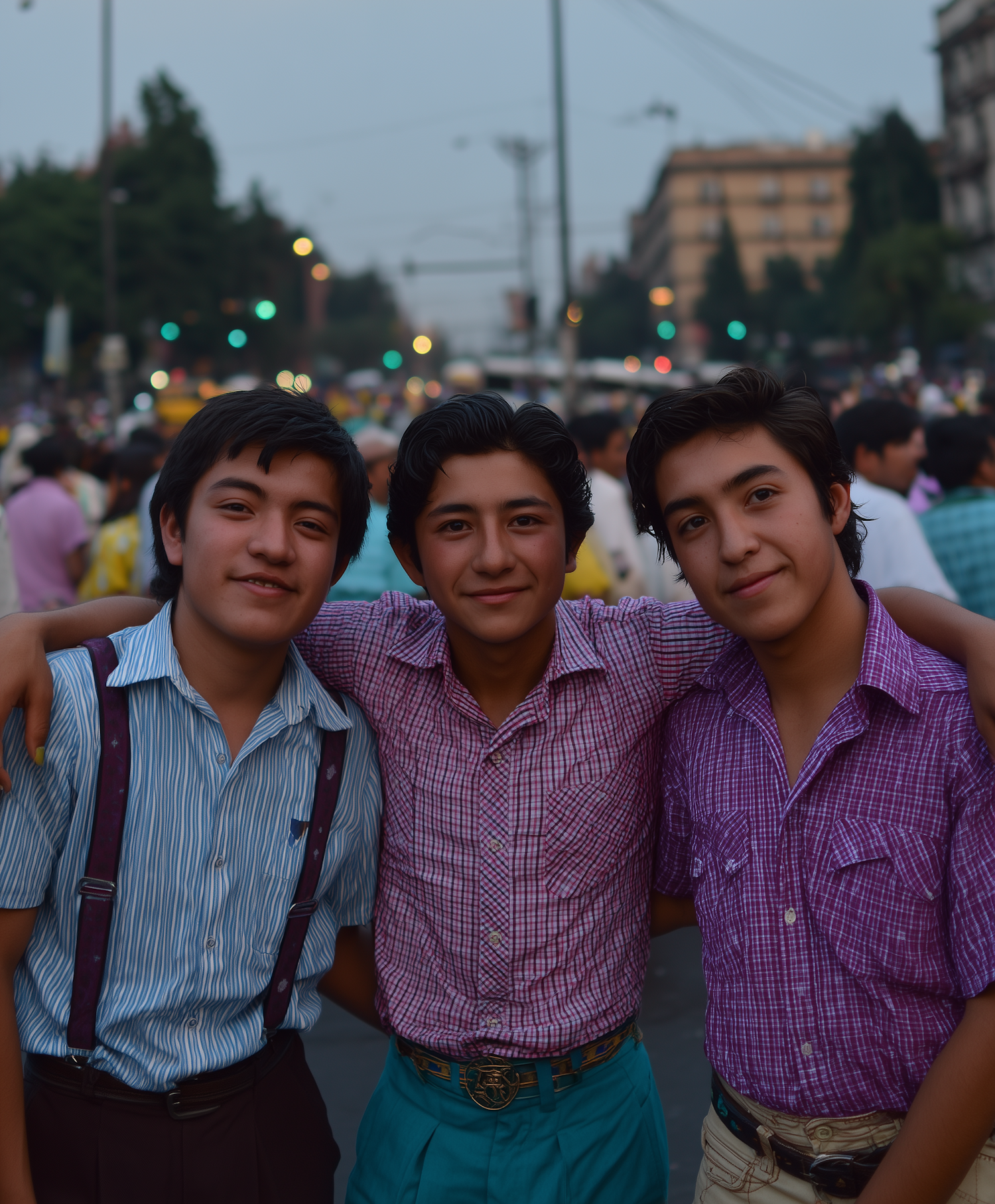 Three friends in vintage attire smile warmly in a lively urban setting, showcasing camaraderie and vibrant fashion.