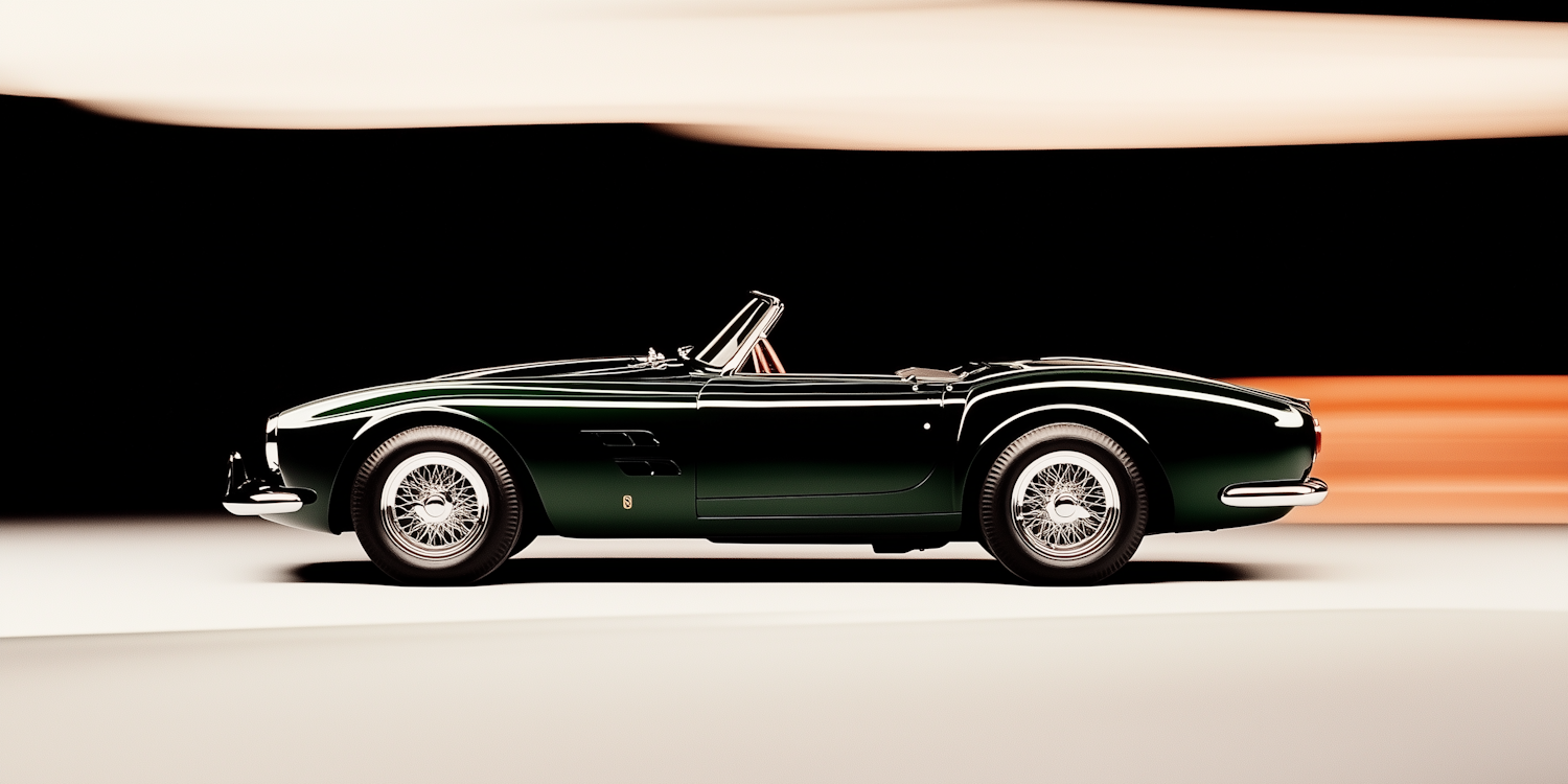 Classic green convertible sports car with white stripes, chrome accents, and tan leather interior against a black and orange gradient backdrop.