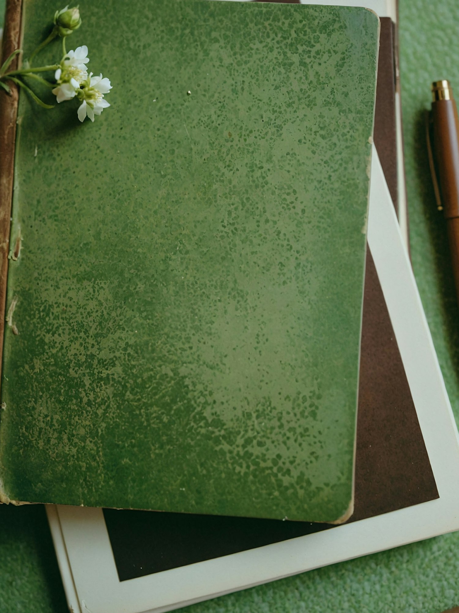 Vintage green notebook with textured cover, white flowers, and a brown pen on a soft green background. Nostalgic and creative vibe.