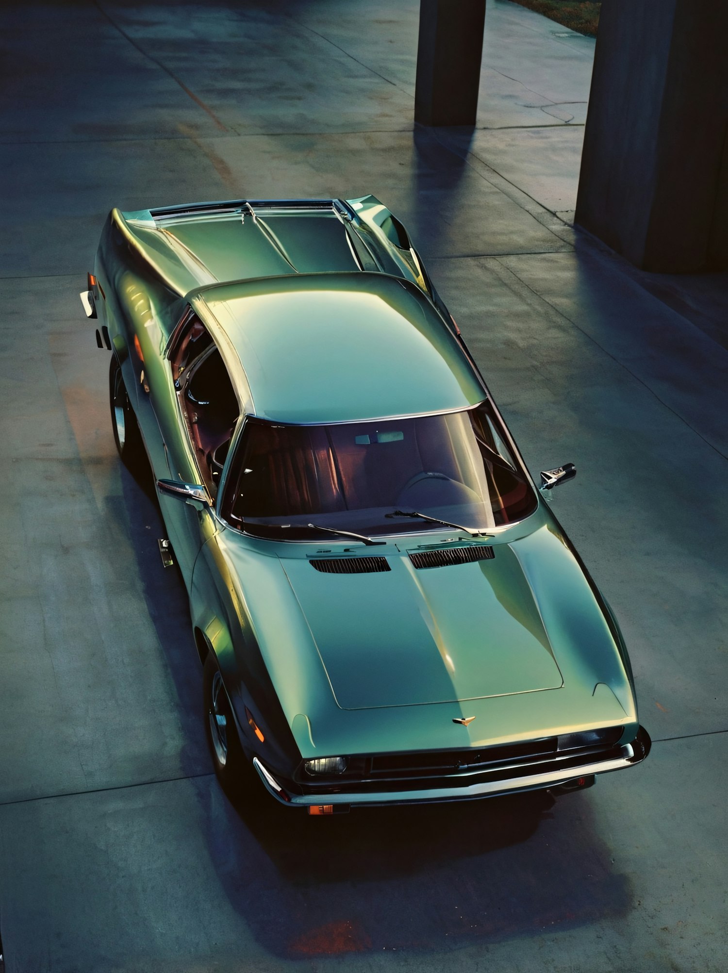 Vintage green sports car with sleek design and glossy finish, captured from above on a concrete surface with dramatic shadows.