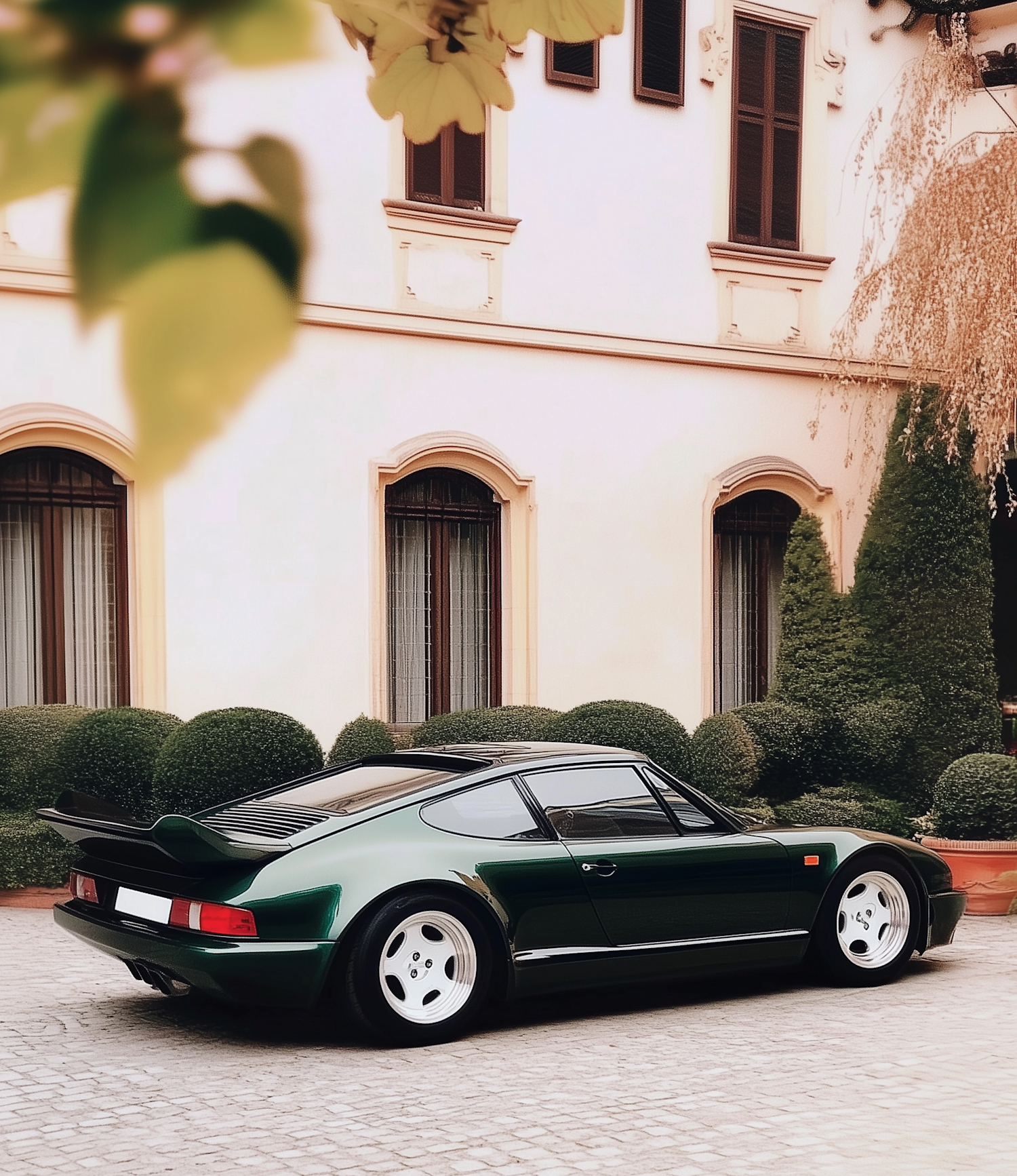 Classic dark green sports car parked in front of an elegant building with arched windows and manicured greenery.