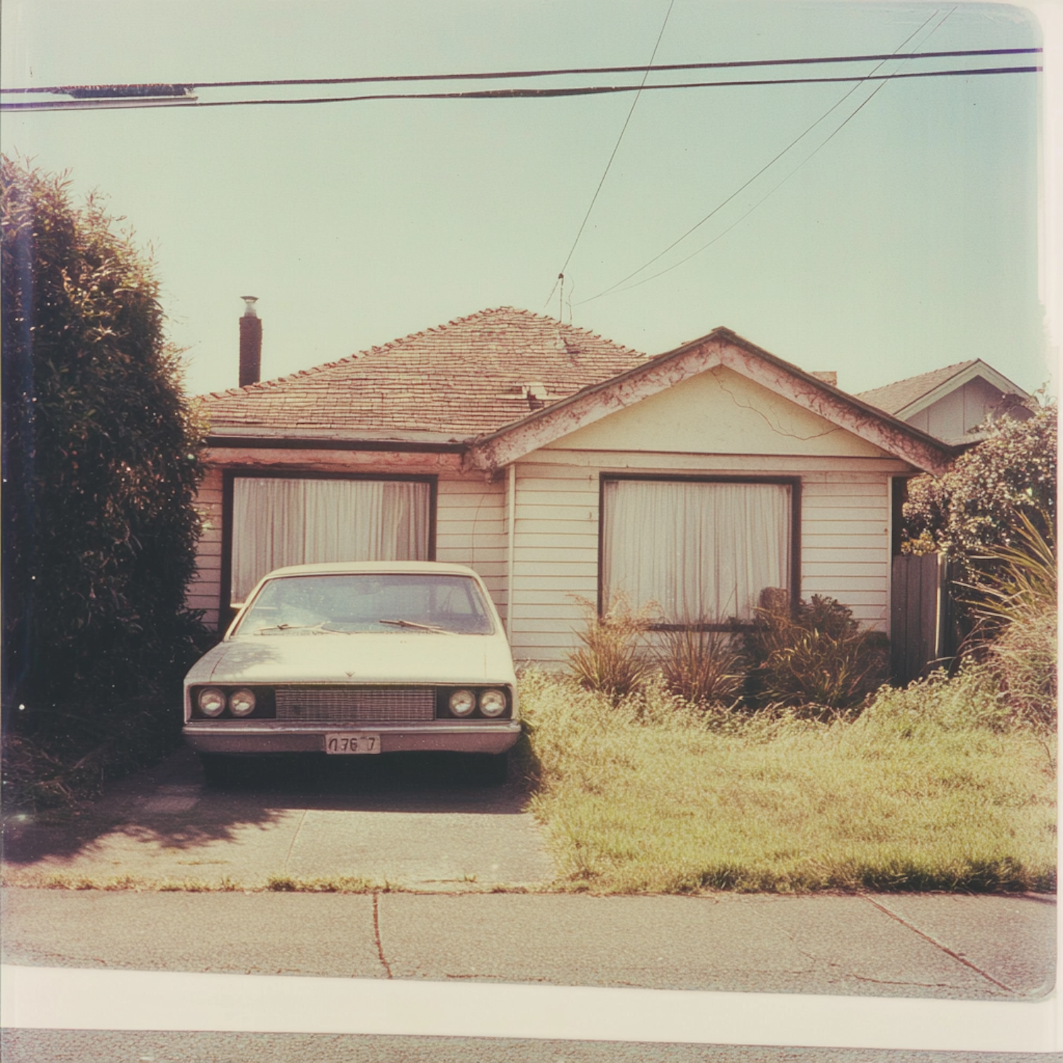 Vintage car parked in front of an old house with overgrown garden and clear blue sky, evoking a nostalgic atmosphere.