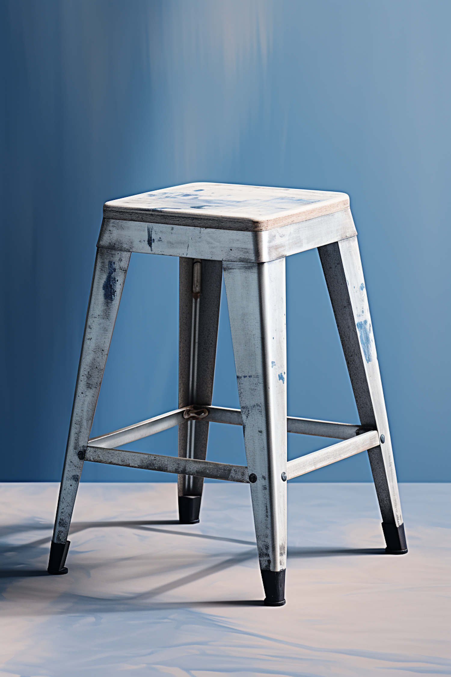 Industrial metal stool with distressed blue finish against a gradient blue background, showcasing a modern, minimalist design.