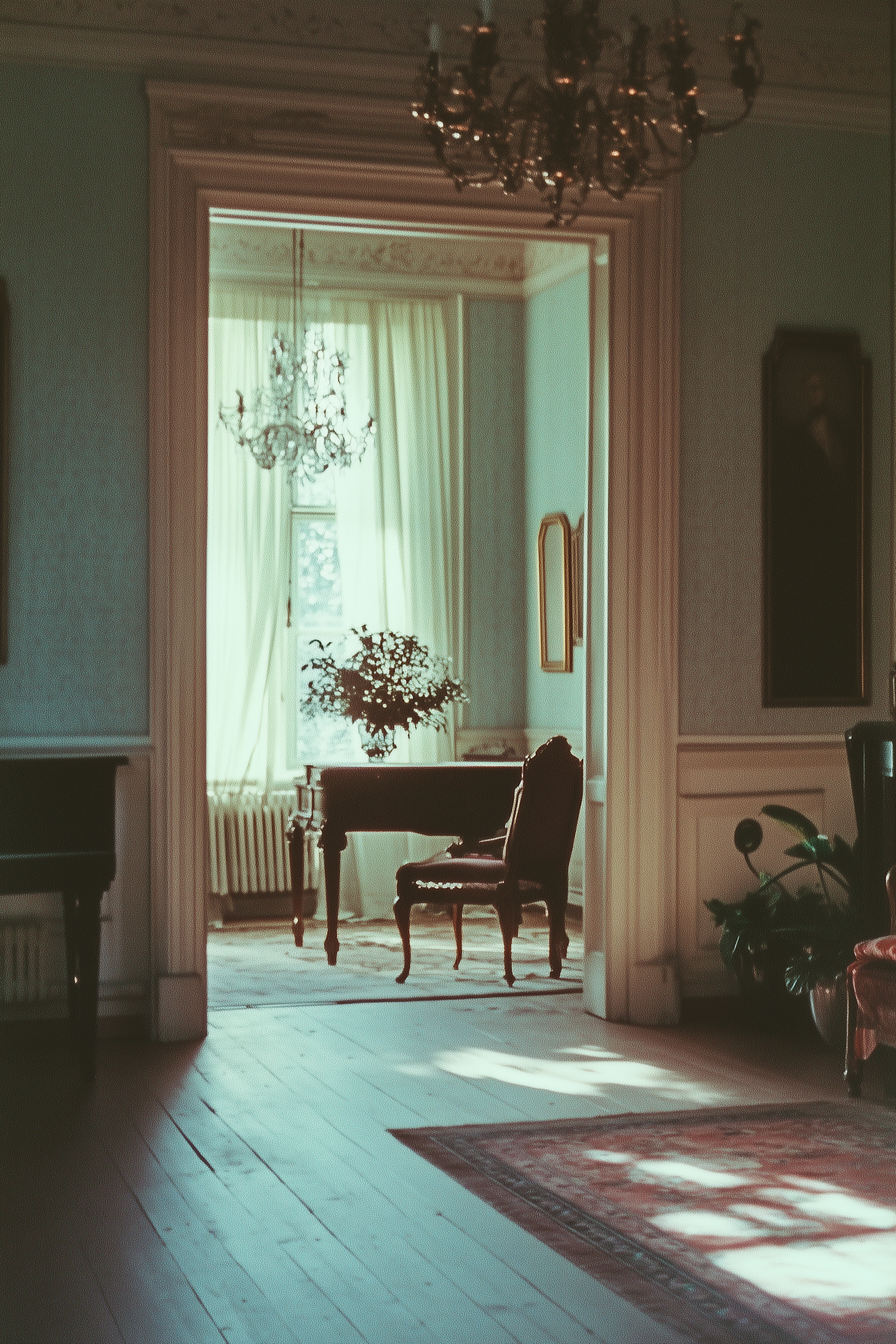 Elegant vintage room with wooden floors, chandelier, and natural light. Features a classic chair, table, and lush plant near a window.