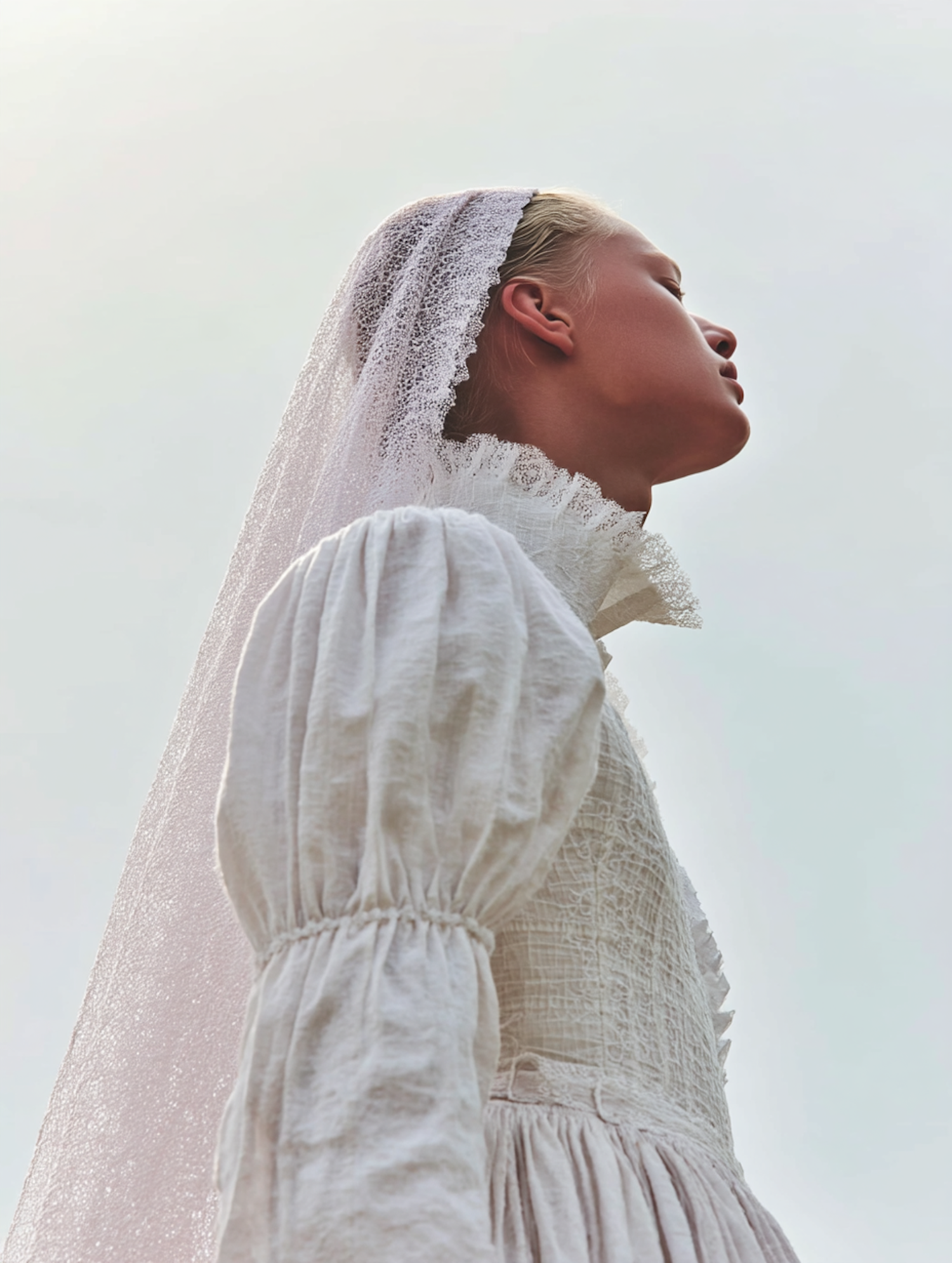 Low-angle shot of a person in a vintage white dress with lace details and veil, set against a soft, overcast sky.