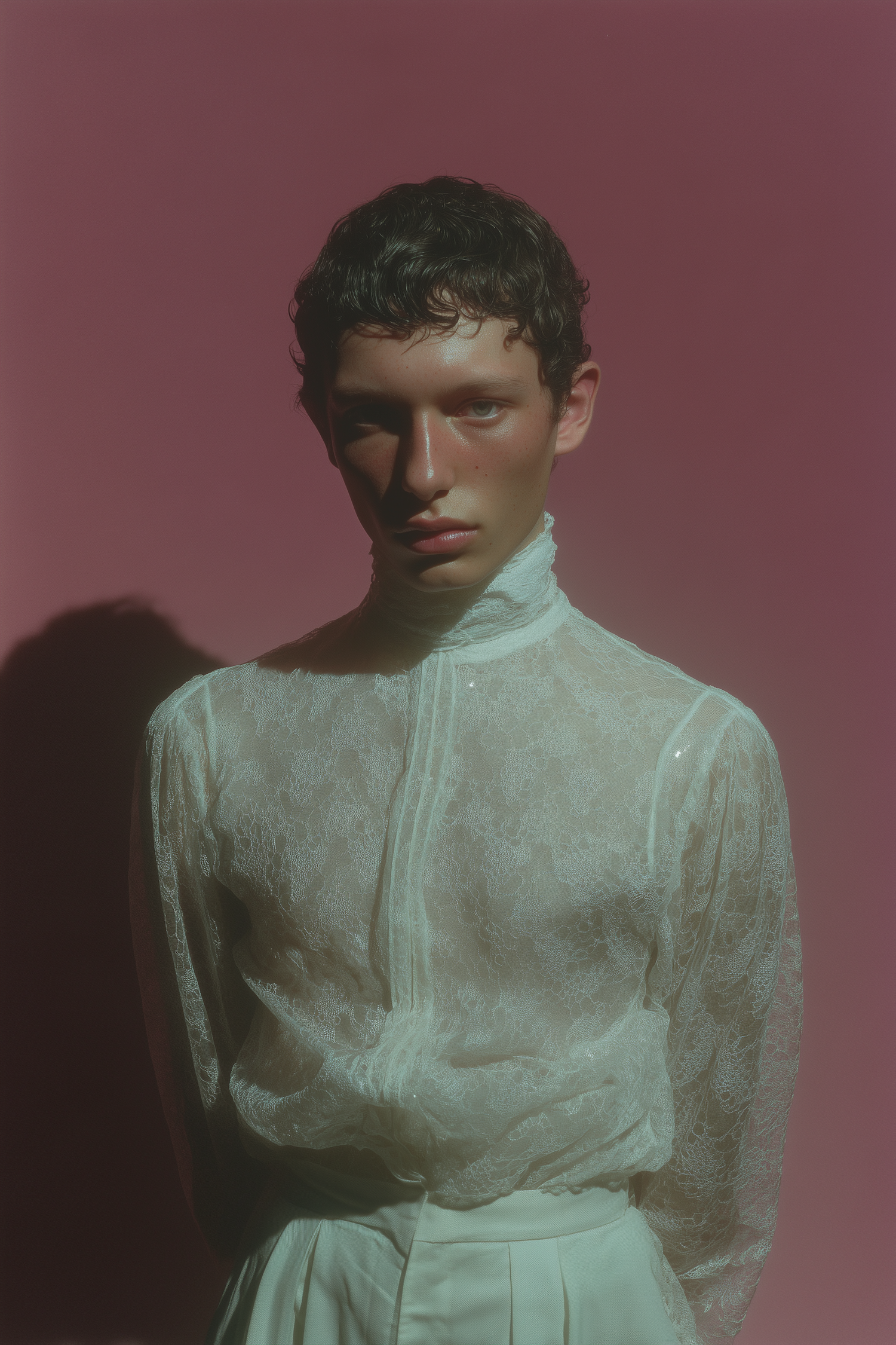 A person in a sheer white lace blouse and pleated trousers stands against a muted pink background, creating a vintage aesthetic.