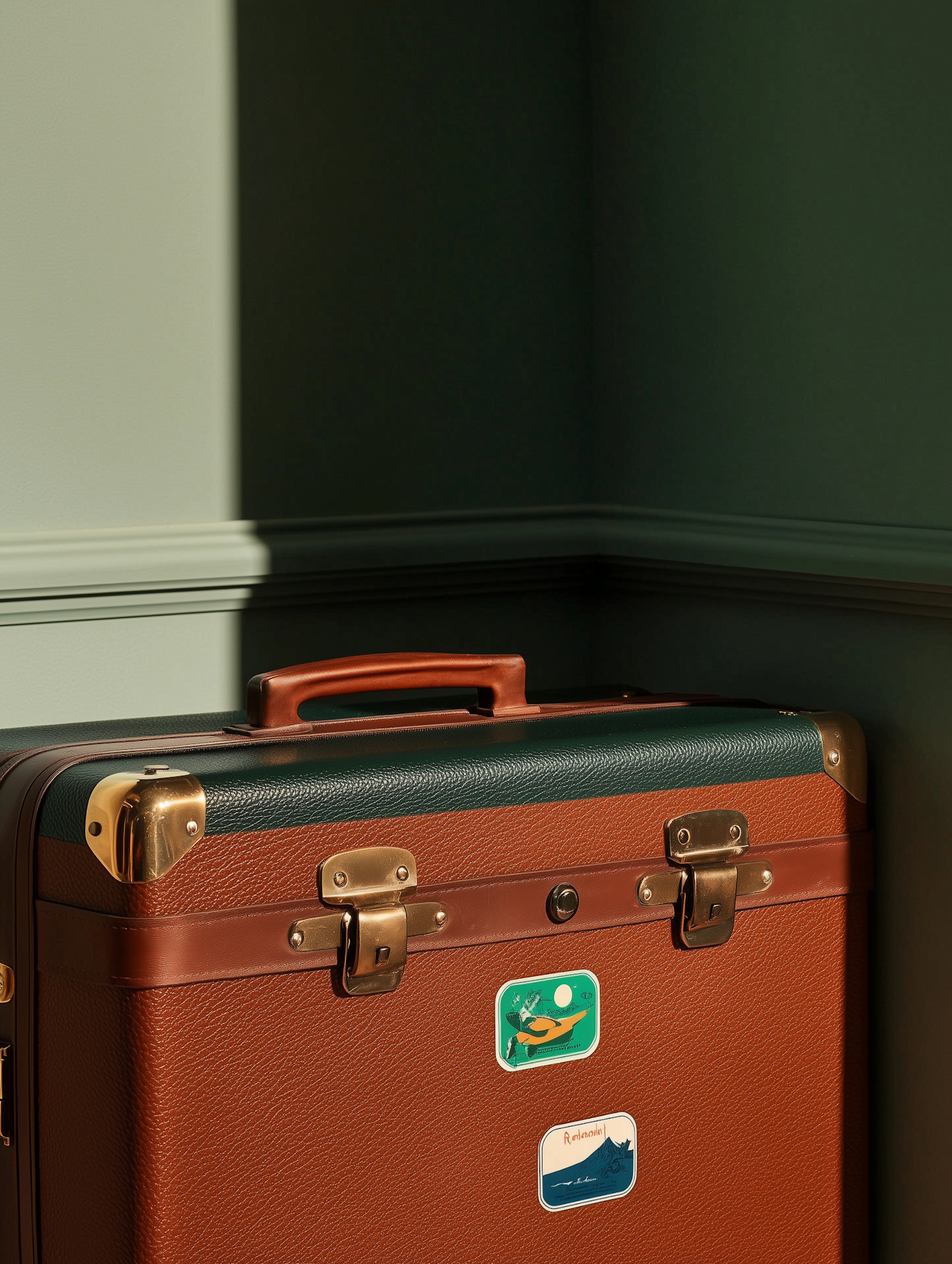 Elegant vintage suitcase with brown leather, green accents, brass hardware, and travel stickers in a softly lit green-walled corner.