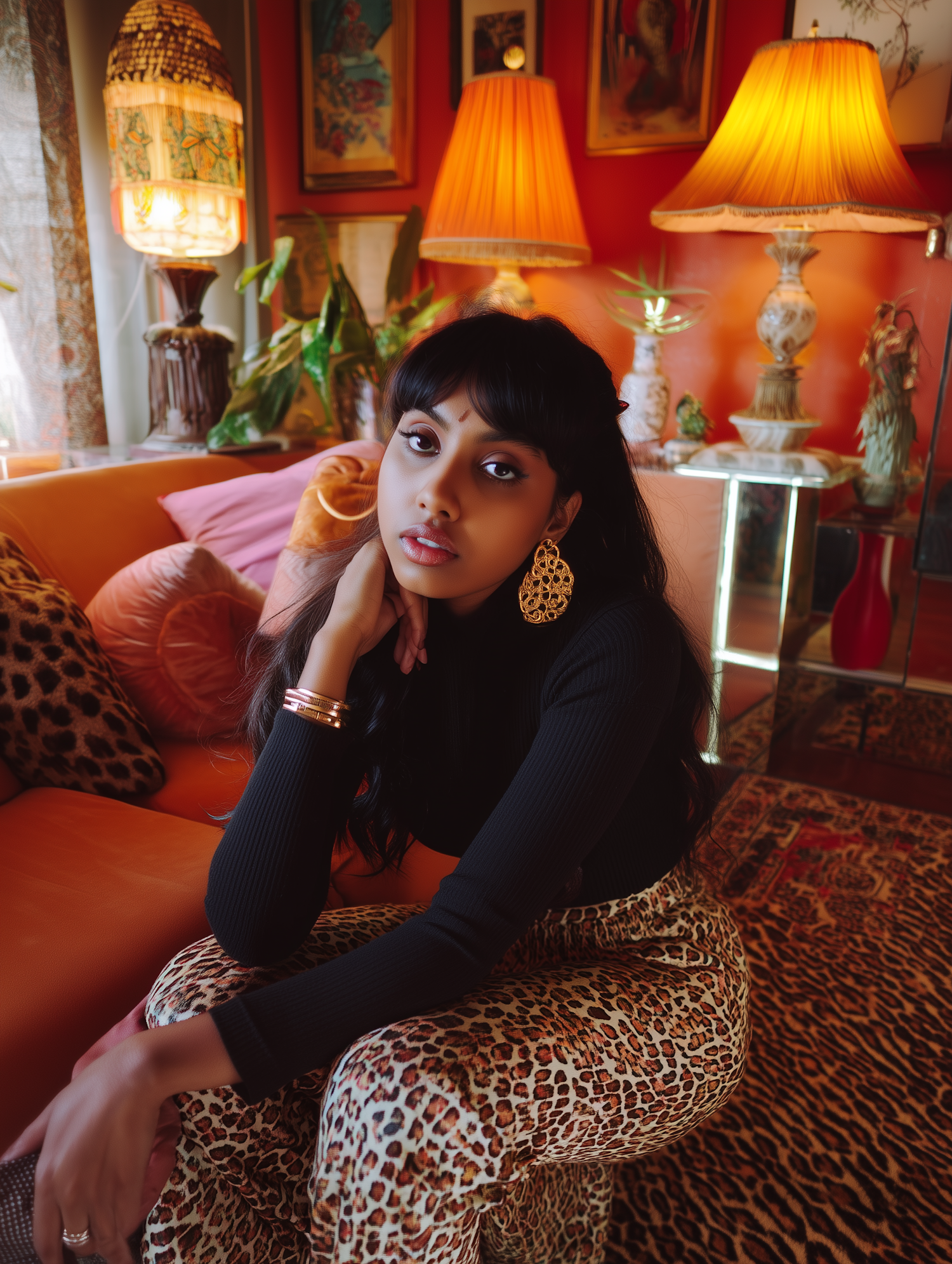 Stylish woman in leopard-print pants and gold accessories in a cozy, vintage-inspired living room with warm lighting and eclectic decor.