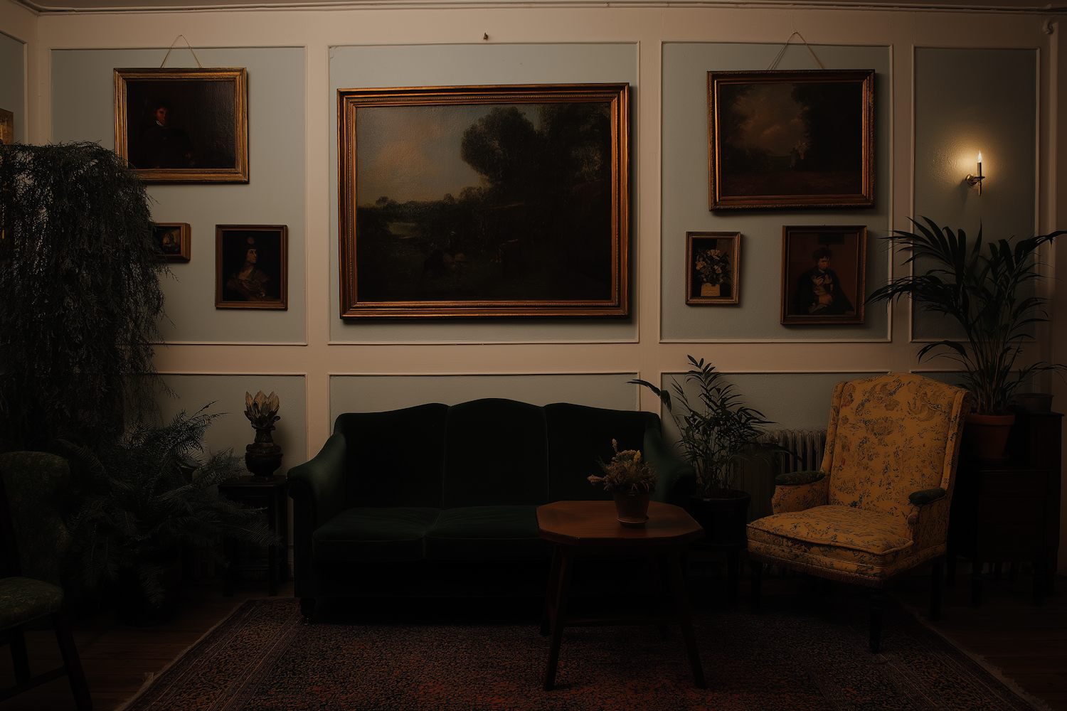 Cozy vintage living room with a green velvet sofa, yellow armchair, framed paintings, and lush plants in a dimly lit ambiance.