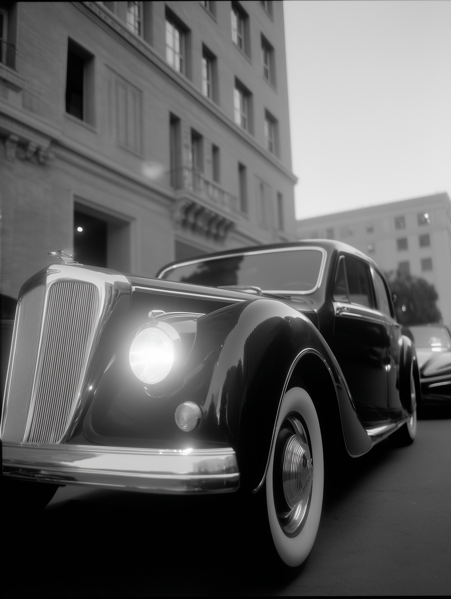 A stunning black-and-white shot of a vintage luxury car with whitewall tires and chrome accents, parked in front of a classic city building.
