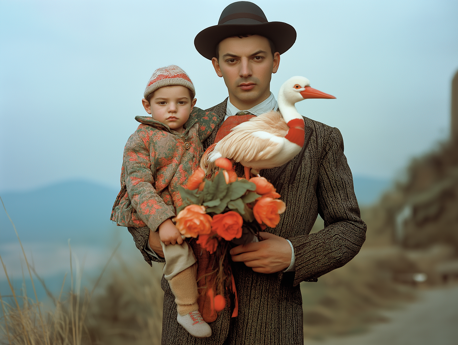 Man in suit and hat holds child, bouquet, and stork in vintage-style outdoor portrait.