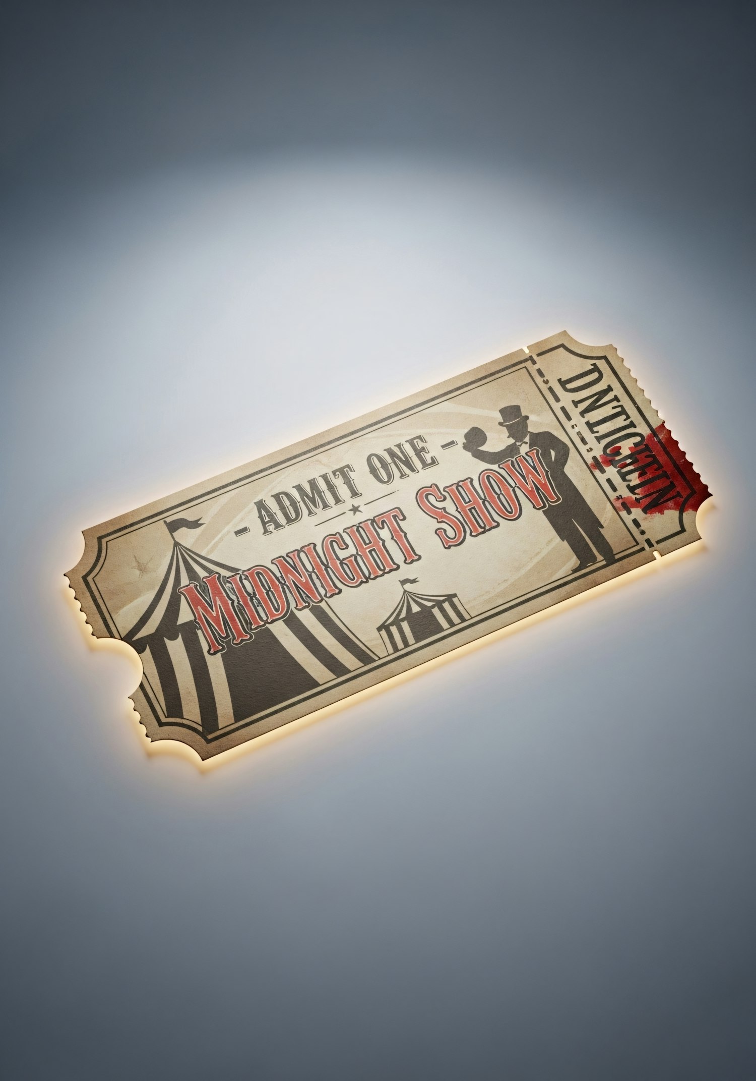 A vintage-style ticket for a 'Midnight Show' with ornate edges, circus imagery, and glowing highlights on a gradient background.