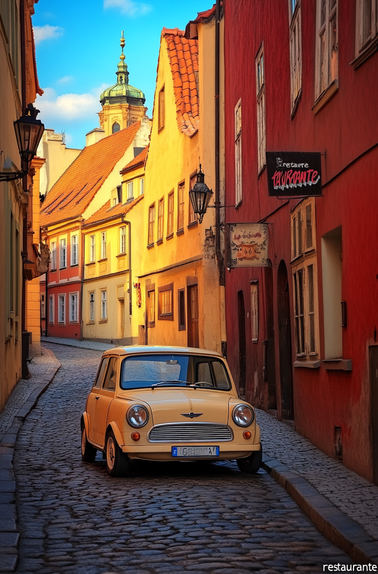 Charming European street with colorful buildings and a vintage yellow Mini Cooper. Quaint cobblestone path and a church tower in the background.