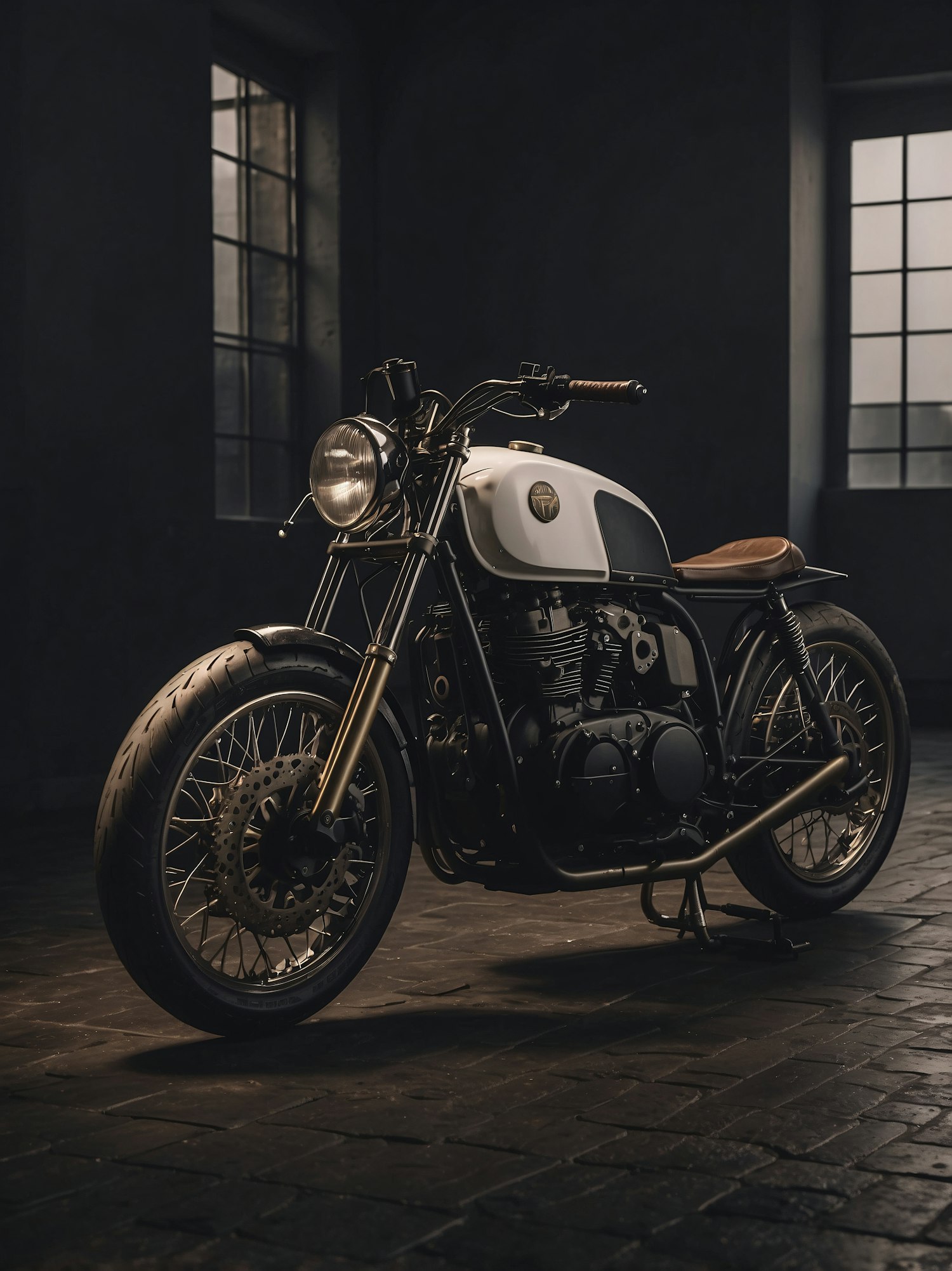 Vintage motorcycle with white tank and brown leather seat in a dimly lit room, showcasing classic design and elegance.