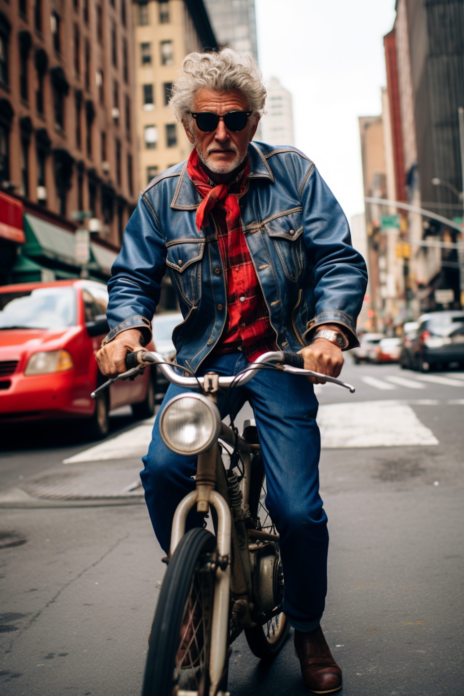 Stylish older man in denim and plaid rides a vintage bike through a bustling city street, exuding confidence and flair.