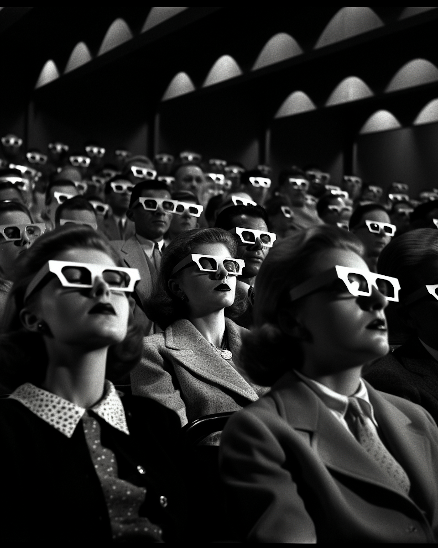 Vintage theater audience wearing 3D glasses, engaged in a classic film experience. Black and white, mid-20th century style.