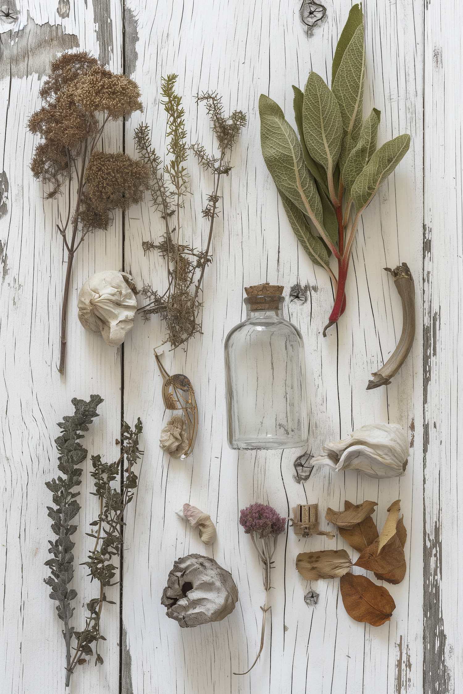 Rustic arrangement of dried herbs and leaves on a weathered wooden surface with a vintage glass bottle.