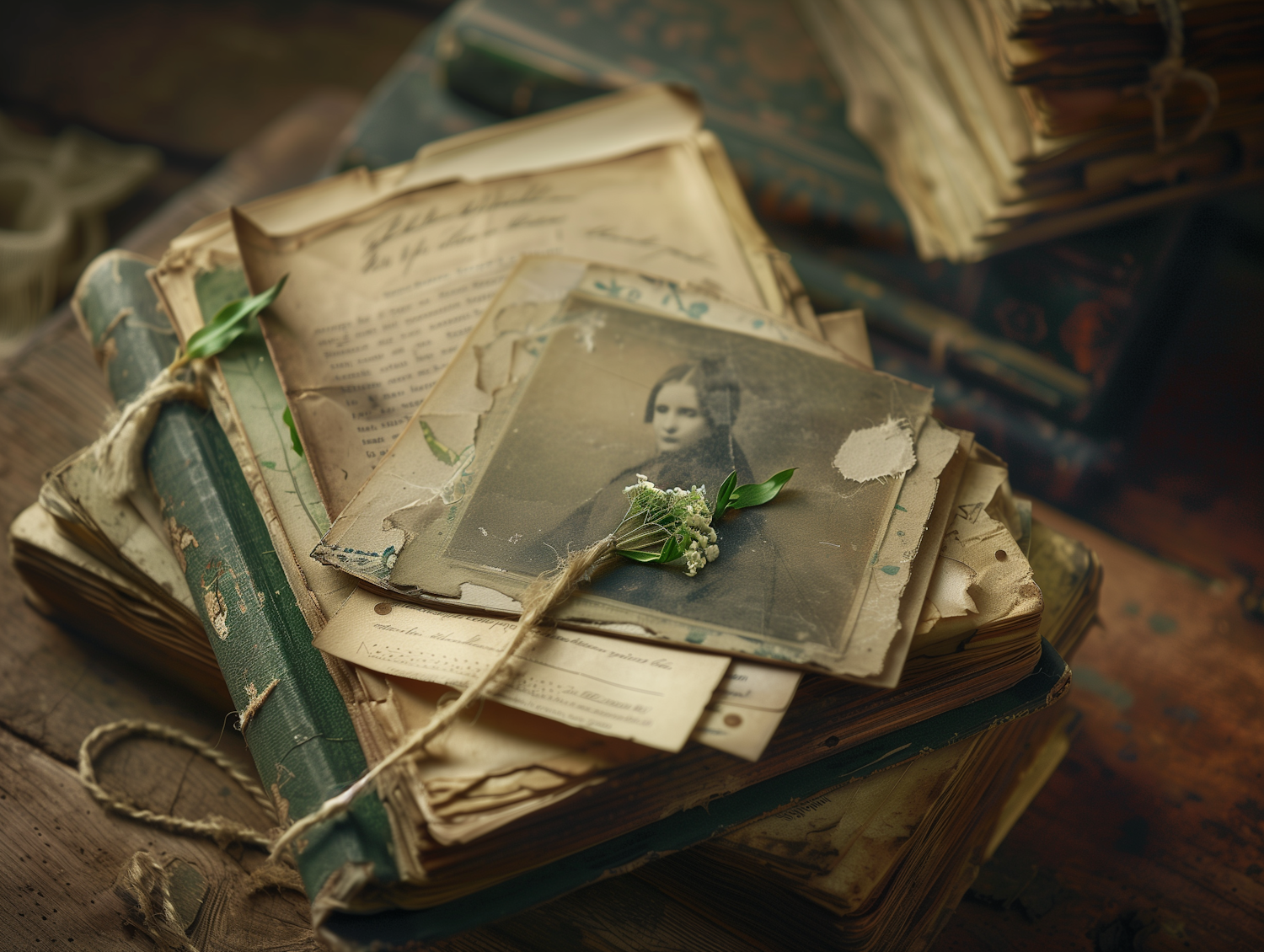 Vintage photograph and aged books with a sprig of greenery, evoking nostalgia and history on a wooden surface.