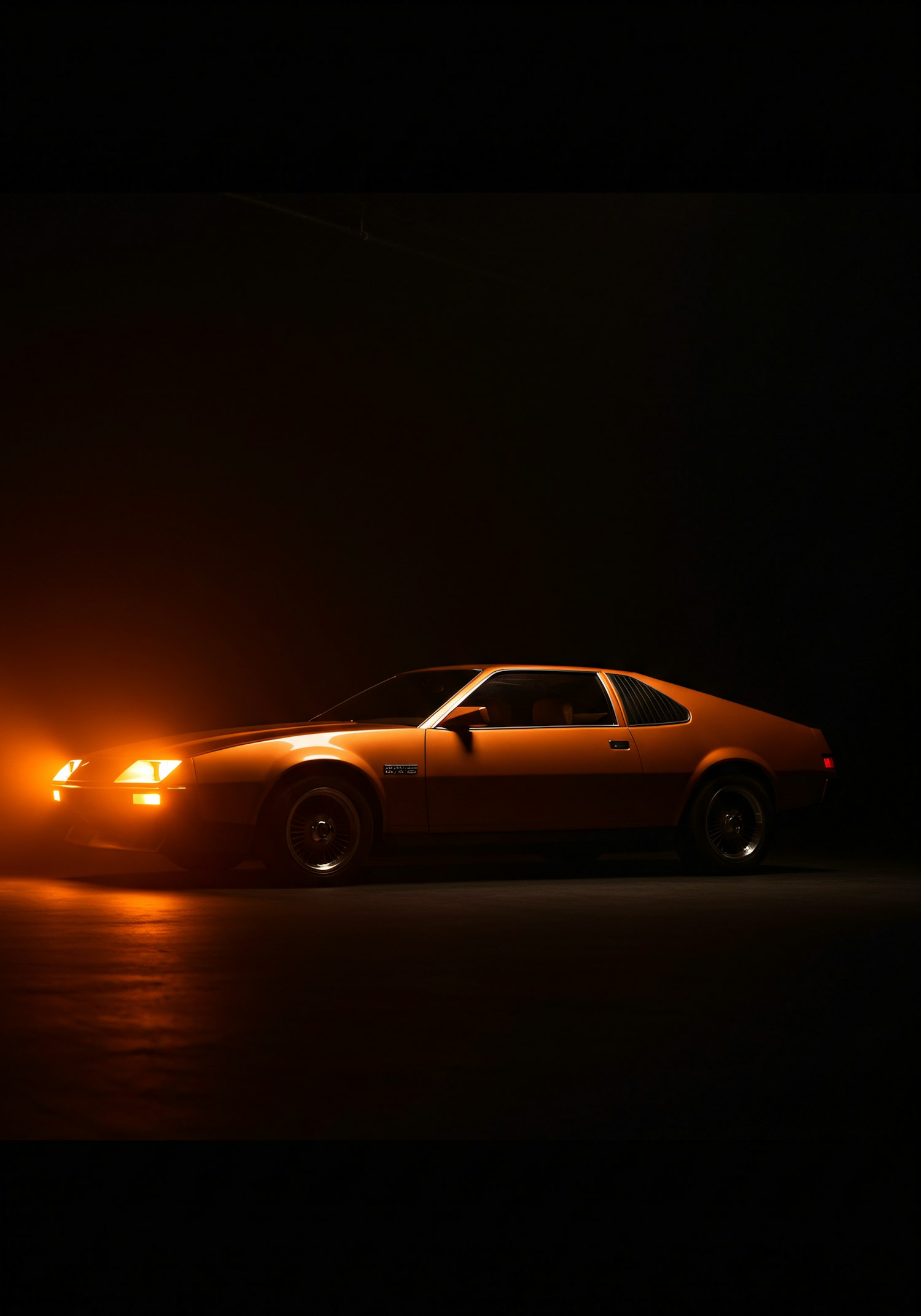 A classic orange sports car with headlights on, showcased in a dramatic dark setting, highlighting its sleek and angular design.