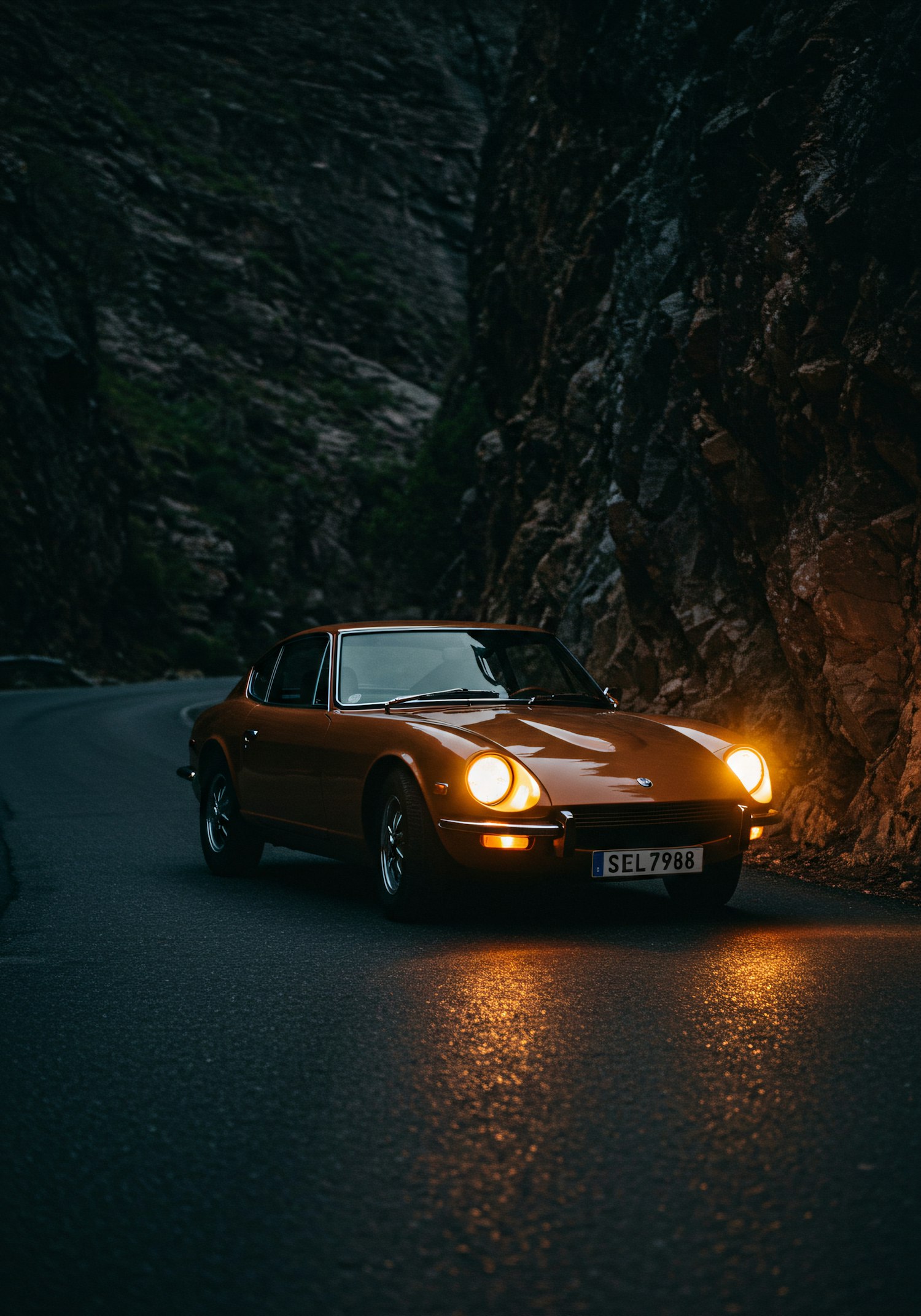 A classic orange sports car with headlights on, parked on a winding mountain road at dusk, surrounded by rugged rock formations.