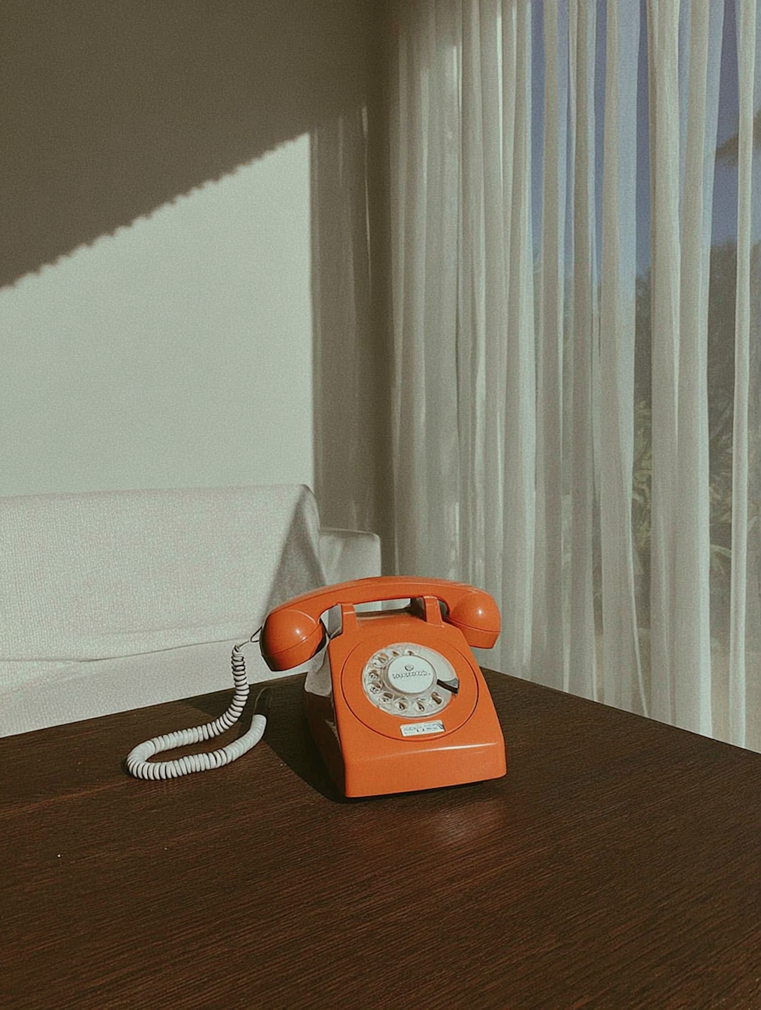 A retro orange rotary phone on a wooden table, with sunlight streaming through sheer curtains in a minimalist setting.