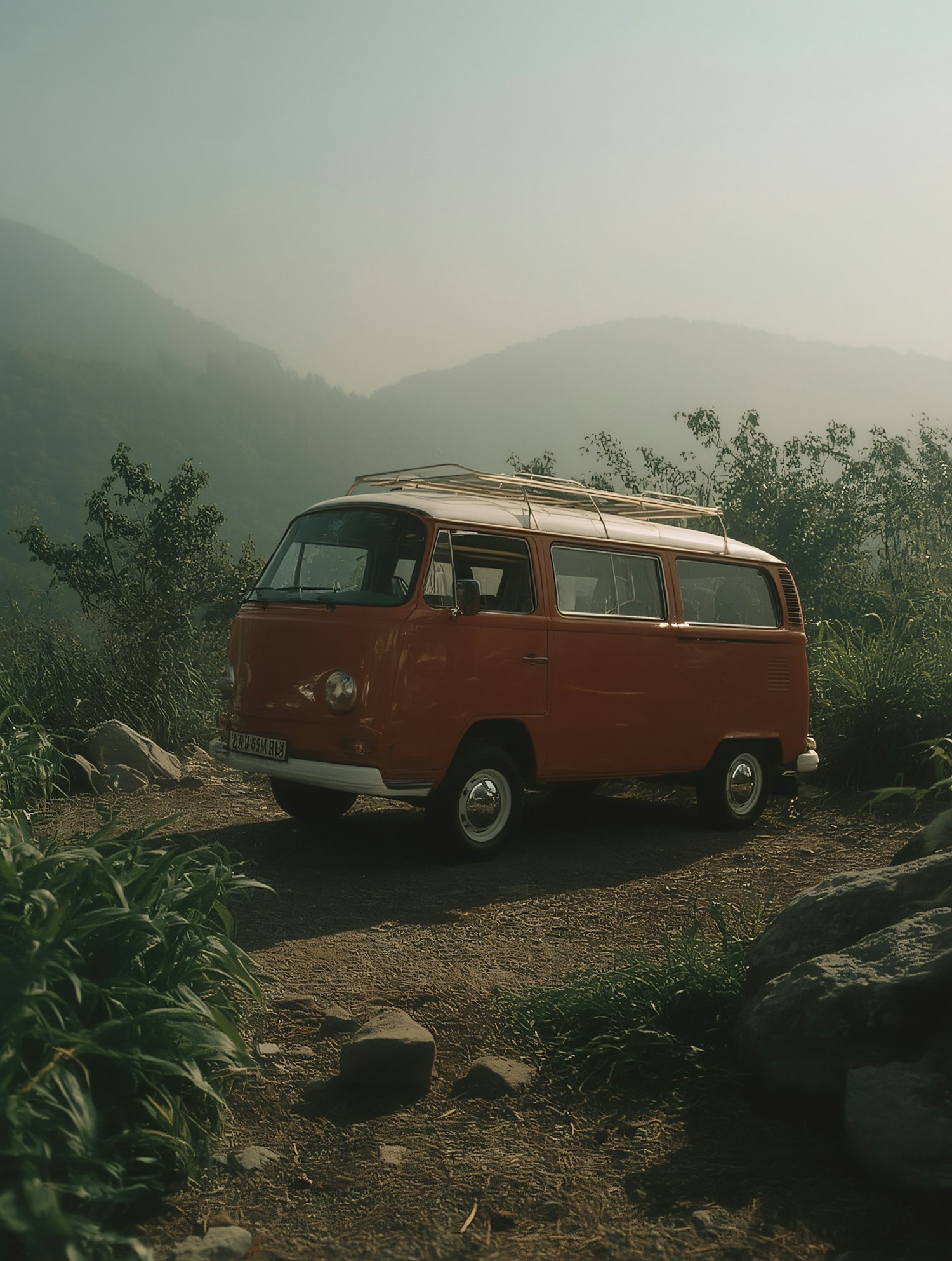 Retro orange van parked on a scenic dirt path with misty hills and lush greenery, perfect for a nostalgic road trip vibe.