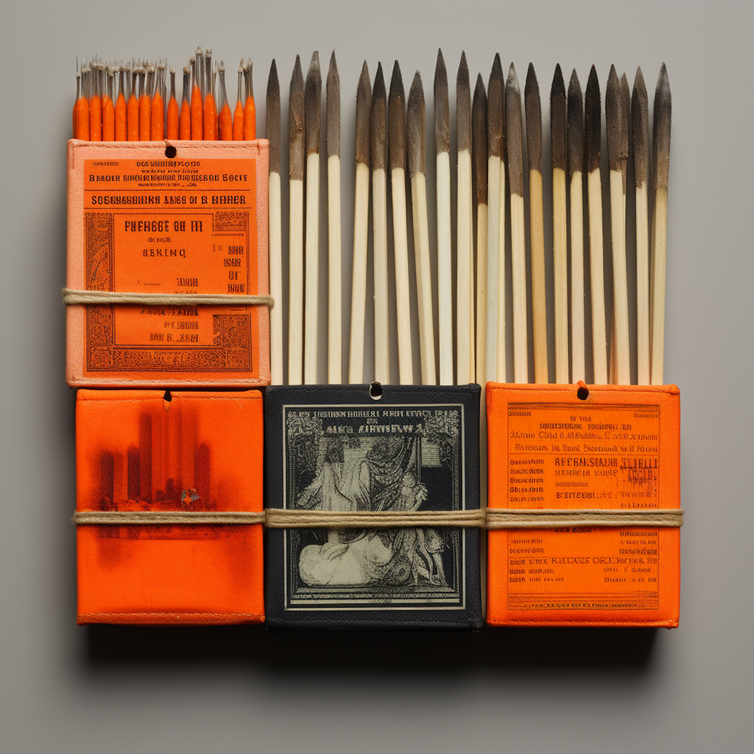 Vintage matchboxes and matches arranged in a neat display, featuring orange boxes with intricate designs and colorful match heads.