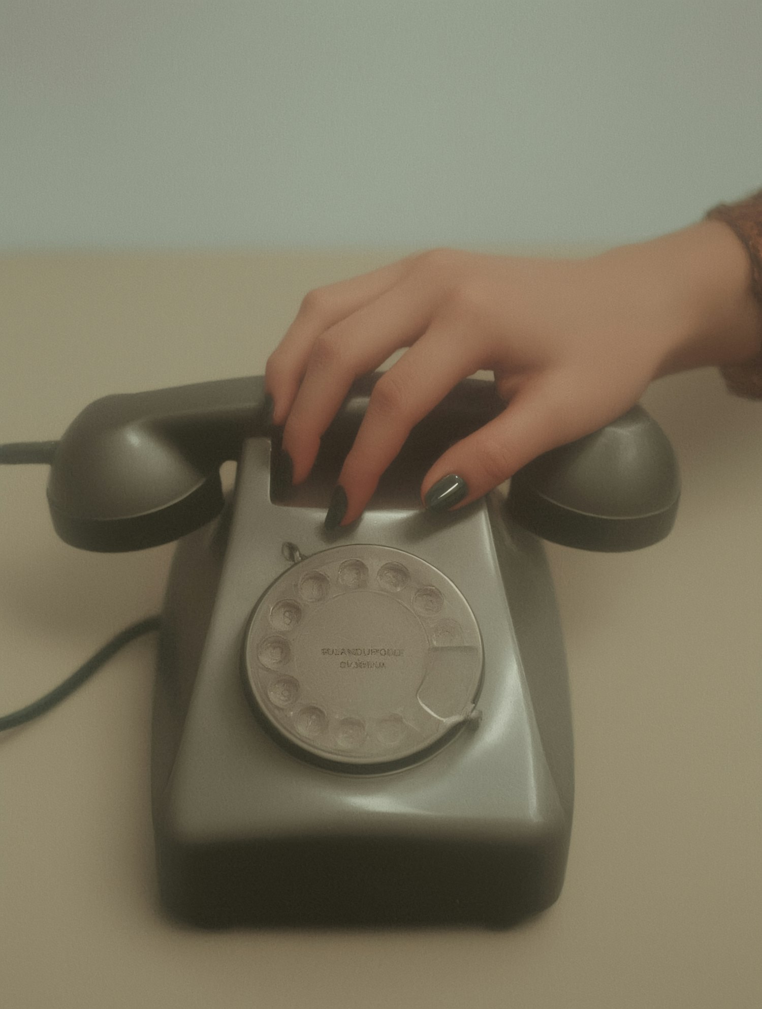 A hand with dark green nails rests on a vintage rotary phone, evoking a nostalgic and retro vibe with soft, muted tones.