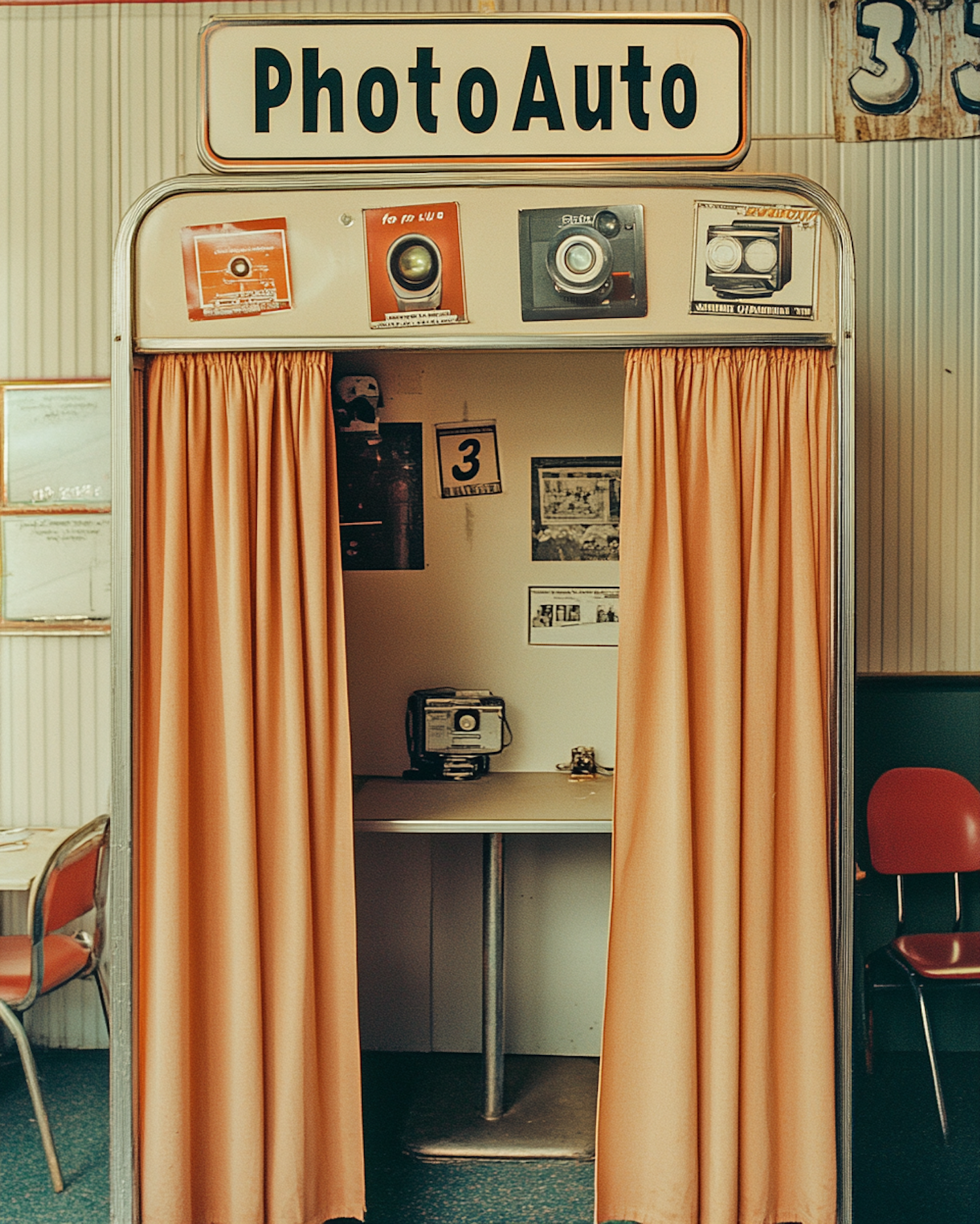 Vintage photo booth with orange curtains and retro camera setup, evoking nostalgia with warm tones and classic design.