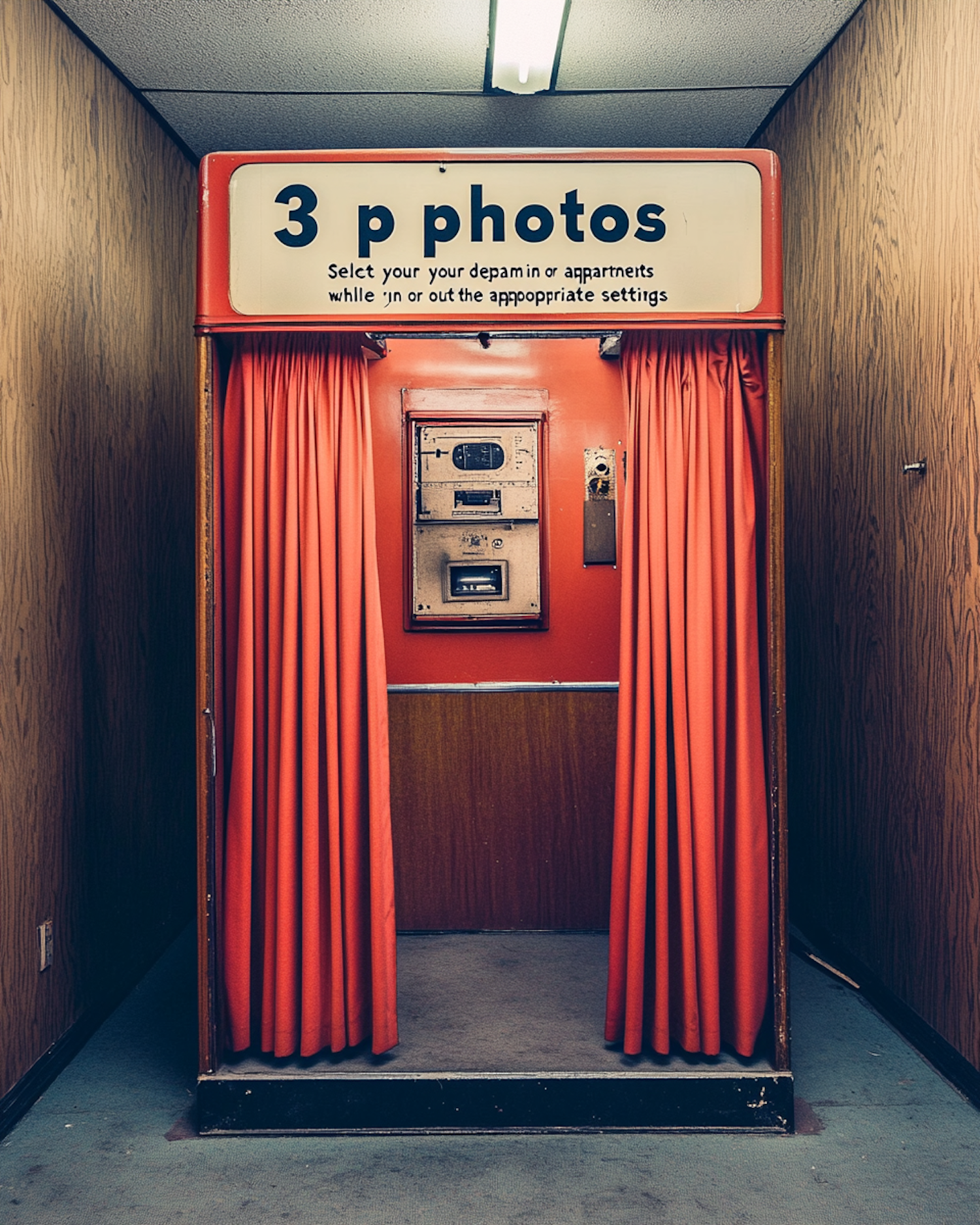 Vintage photo booth with red curtains and retro signage in a dimly lit room, evoking nostalgia and classic charm.