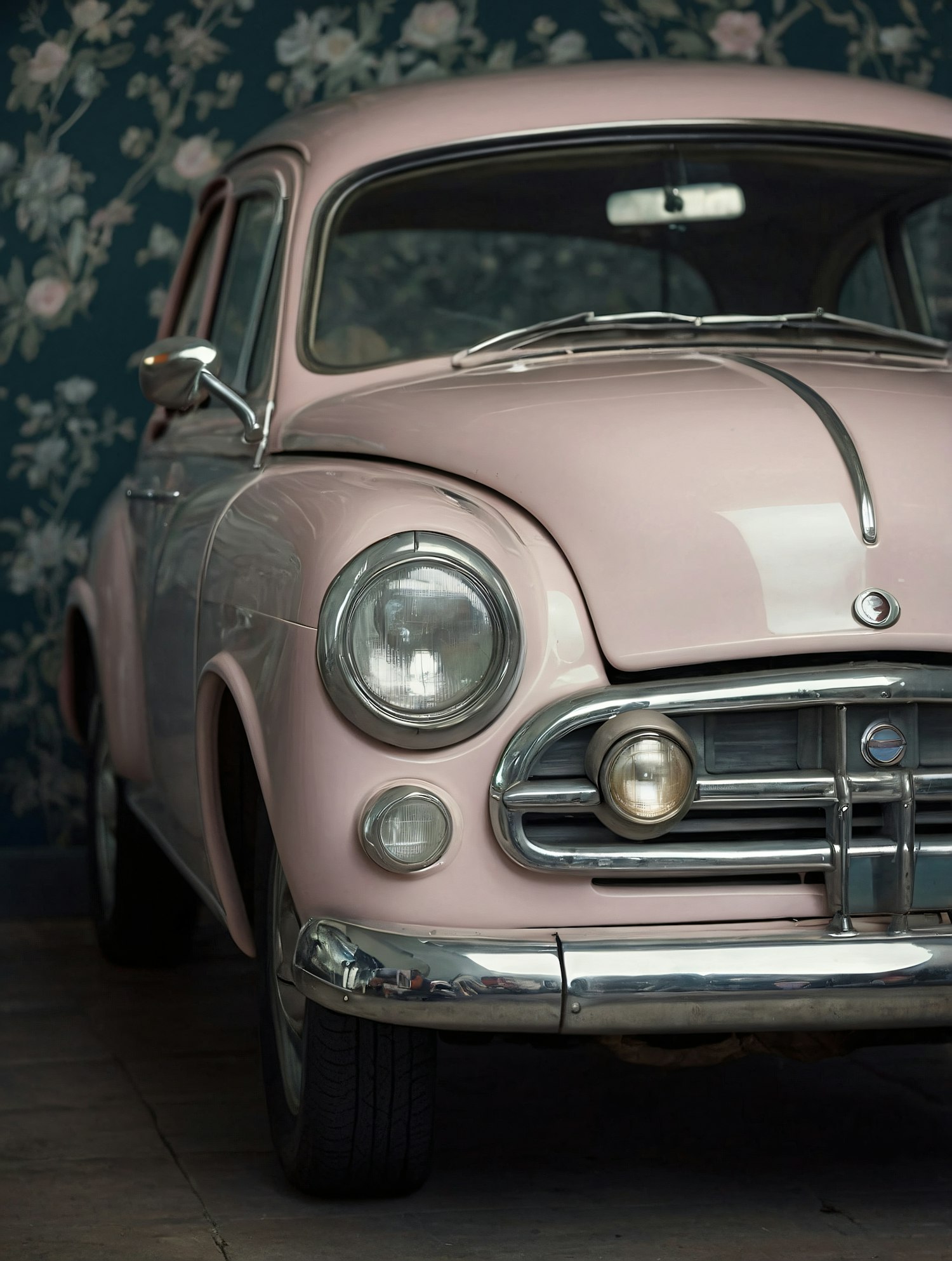 Vintage pastel pink car with chrome details against a floral wallpaper backdrop, exuding retro elegance and charm.