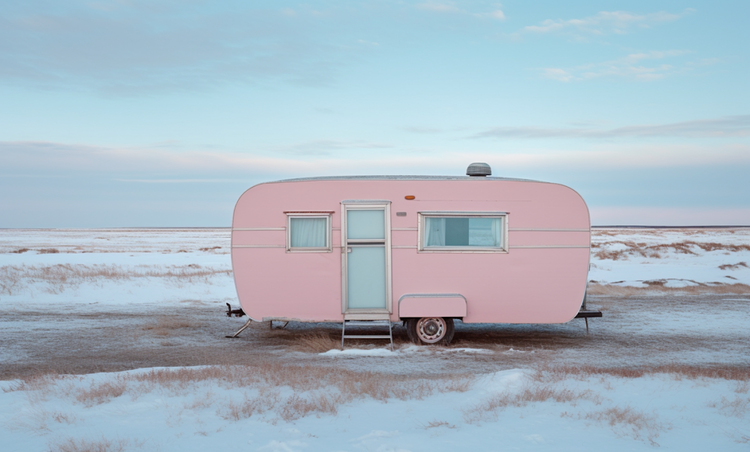 Pastel pink caravan in a snowy landscape under a pale blue sky, creating a serene and whimsical scene.
