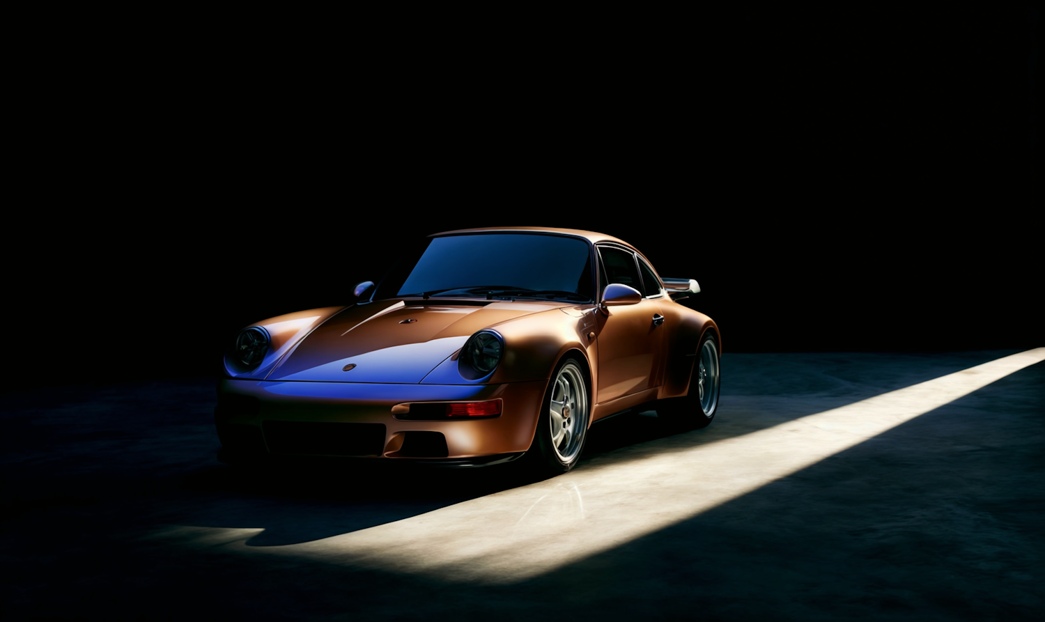 A stunning bronze vintage Porsche 911 sports car illuminated dramatically in a dark setting, showcasing its sleek design and polished details.