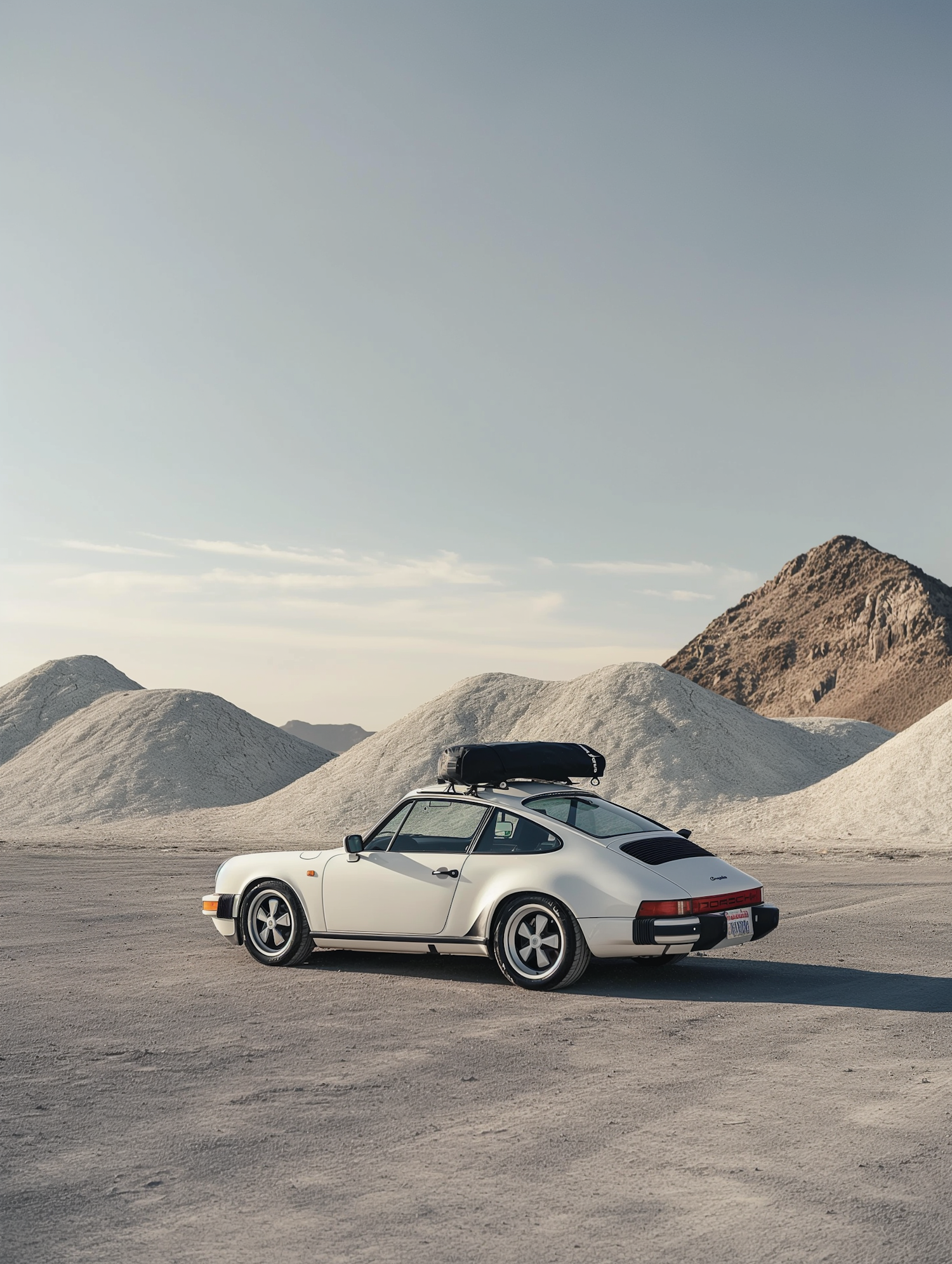 Classic white sports car with roof rack in a desert setting, surrounded by sand dunes under a clear sky.