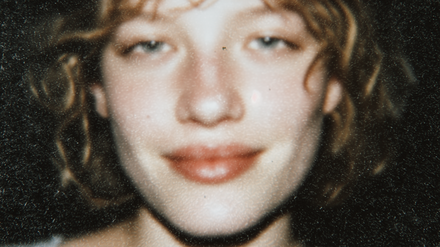 Close-up portrait with a vintage, grainy texture. Light brown curly hair, soft smile, and dark background create an artistic, nostalgic vibe.