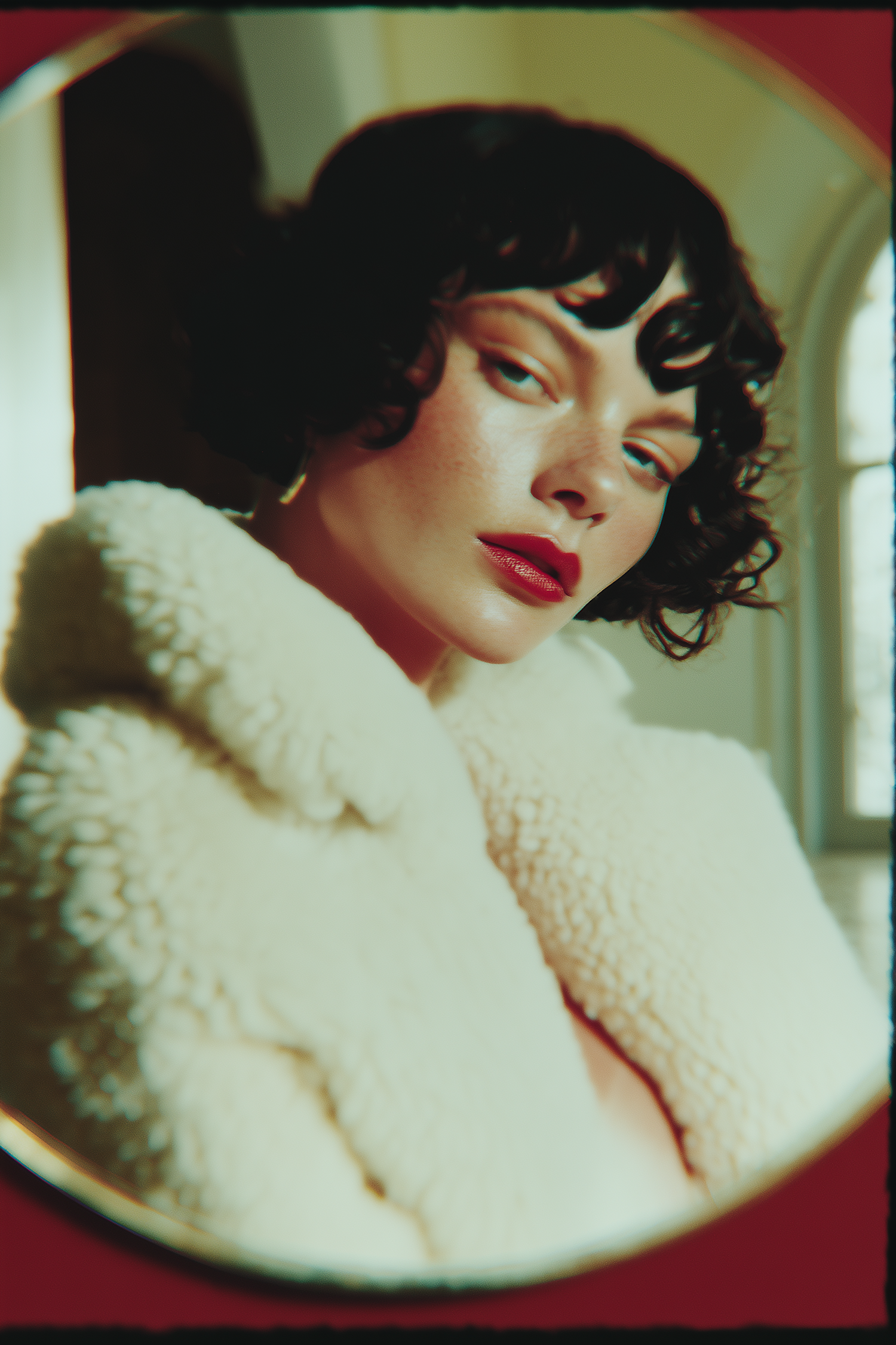 Close-up portrait of a person with short curly hair, wearing a white textured coat, in a softly lit indoor setting with a vintage aesthetic.