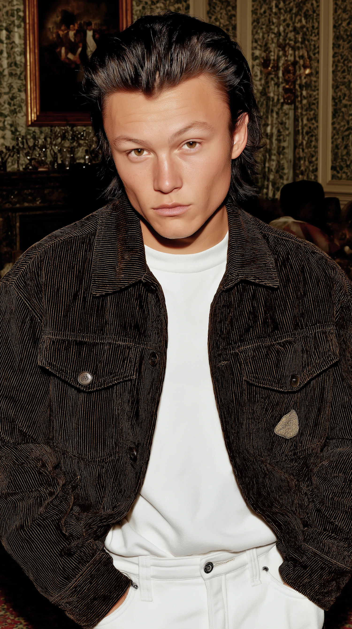 A stylish individual in a dark jacket and white outfit poses in a vintage-inspired interior with ornate decor and a classic ambiance.