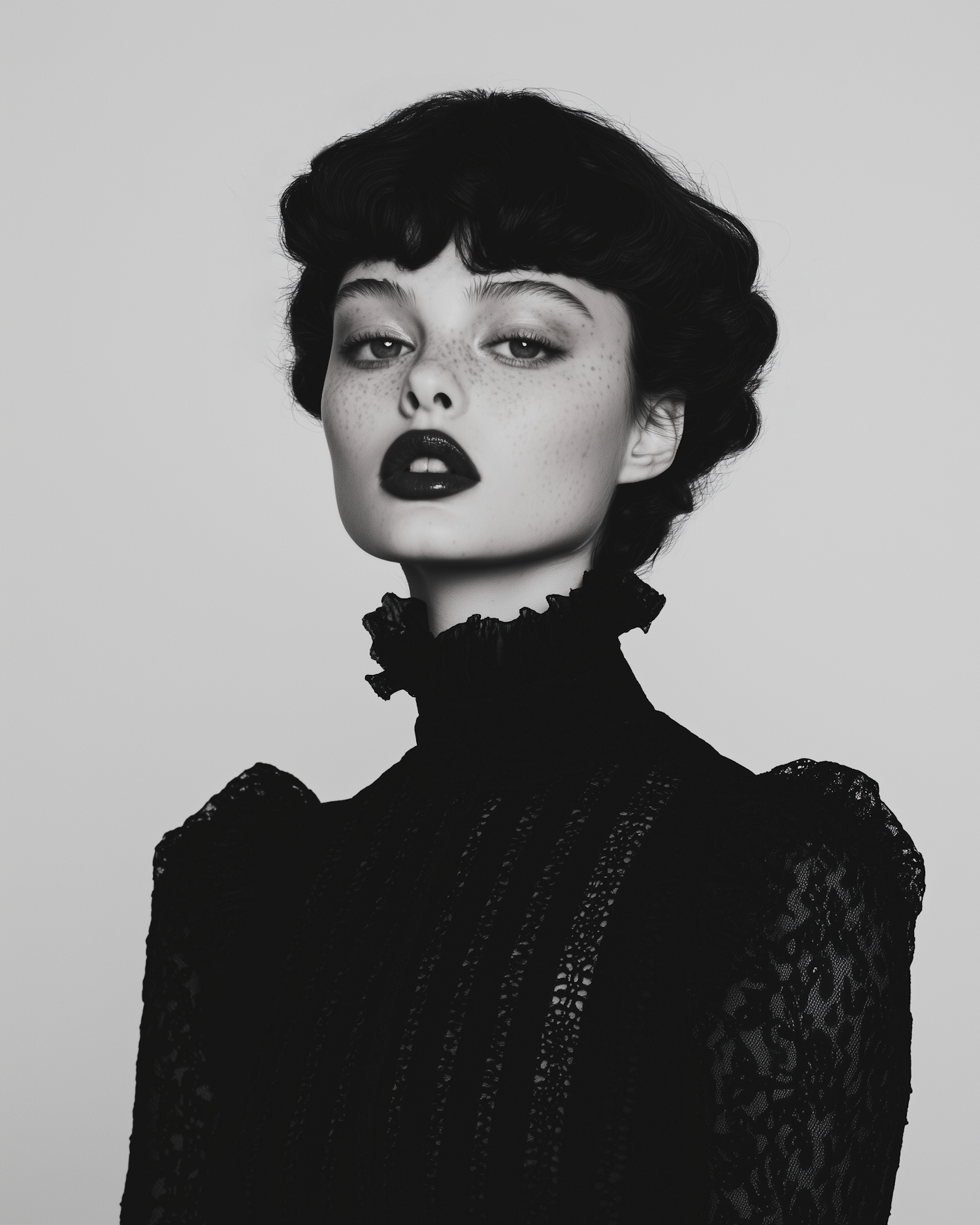 Elegant black and white portrait of a woman with dark hair, bold lipstick, and a vintage lace dress, exuding confidence and sophistication.