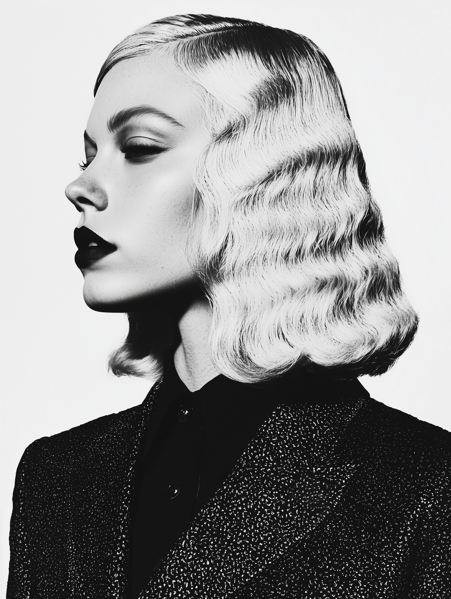 Elegant black-and-white portrait of a woman with vintage finger waves, bold makeup, and a textured blazer, exuding timeless sophistication.