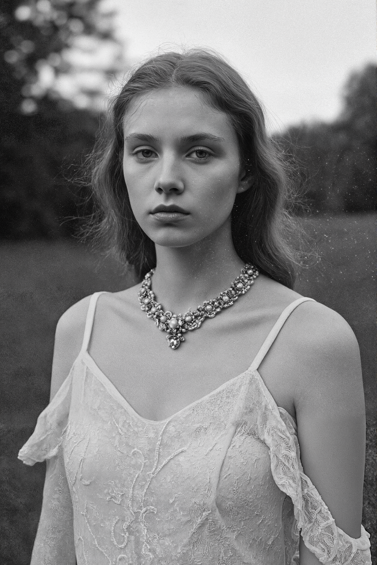 Black-and-white portrait of a woman in a lace dress and ornate necklace, set against a blurred outdoor background.